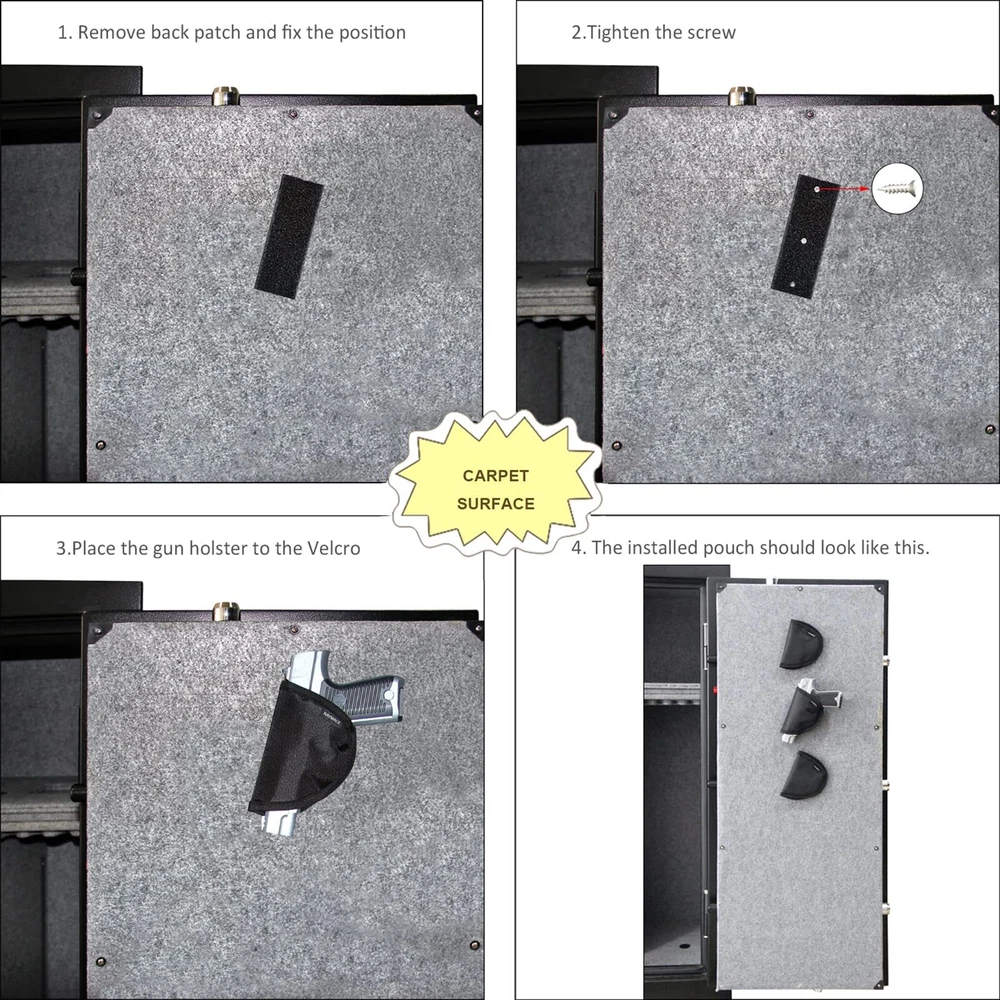 Holster with Adhensive Backing,Safe Accessories Handgun Holster Storage Solution Mount Inside Safes Door DURABLE MATERIAL: The safe holder is made of reinforced Oxford fabric, Strong and lightweight for use forever UNIVERSAL SIZE :6''H*4-3/4''W, Suitable Size to fits any handgun,pistols and revolvers and keep them from being dropped or damaged! TIME SAVING : Put and draw quickly from the safes door back panel ,perfect safe asseccories. WAYS OF INSTALLATION : Adhesive tape with super sticky,Suitable for smooth surfaces Such As steel cabinet, wood board, glass, ceramic tile,marble,etc; Also with the hook and loop tape it can use in safe with Carpet TIPS:Please make sure no moisture, grease or dust on the smooth surface before Sticking.