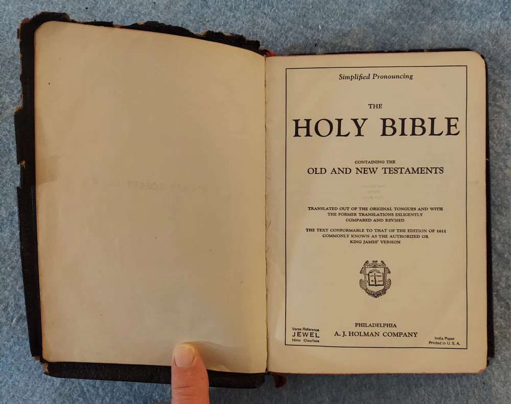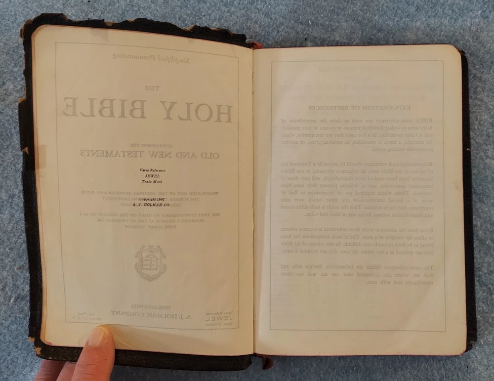 Holy Bible King James Version KJV Genuine Leather Holman Verse Ref Jewel 1942 Simplified Pronouncing THE HOLY BIBLE CONTAINING THE OLD AND NEW TESTAMENTS TRANSLATED OUT OF THE ORIGINAL TONGUES AND WITH THE FORMER TRANSLATIONS DILIGENTLY COMPARED AND REVISED THE TEXT CONFORMABLE TO THAT OF THE EDITION OF 1611 COMMONLY KNOWN AS THE AUTHORIZED OR KING JAMES VERSION HOLMAN COMPANY Verse References JEWEL 16mo Clearface India Paper Copyright 1942 Printed in the U.S.A. Cover: GENUINE LEATHER, black Size: 5 ¾ x 8 ¼ x 1 ¼ inches Pages: Old & New Testaments, 1280; Index to the Atlas to the Bible, 8; Color Atlas to the Bible, 12 See the photo with the coin to judge the size of the print. Features Topical page headings References (in-text cross-references, translation notes) Color Bible Atlas Gold-gilt on page edges This vintage Bible is in good condition, though the edges of the cover are fragile with some broken areas. The name of a previous owner is written and stamped on the second page. Marks are observed on just four pages, small marks in the margins. The binding is good and tight. The cover has just light wear, except around the edges. The overlapping edges are worn and broken off in some areas. There is wear at the top and bottom of the spine. The gold finish on the page edges is a bit worn and scuffed.
