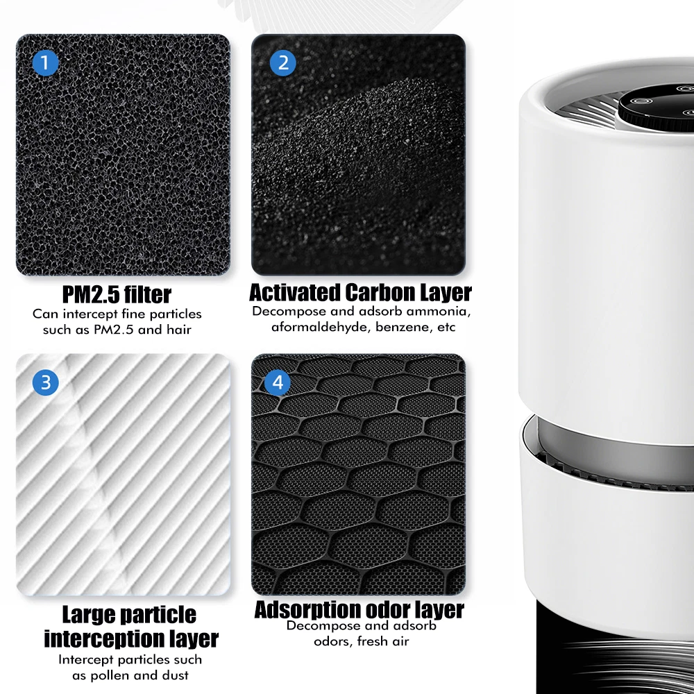 Pack age Lists : 1 * Air Purifier 1 * Filter Cartridge 1 * Charging Cable 1 * English Manual Feature s : Working principle: Activated carbon, HEPA technology Noise: above 70db (dB) Air purifier air volume: below 10 cubic meters per hour Power supply mode: USB Control mode: touch sensitive Applicable area: below 10 square meters Filter type: Composite filter Style: Desktop Style: Minimalist style Applicable scenarios: household use De scription : 1. It can filter out odors, improve air quality, and protect the health of you and your family. 2. Negative ions can purify the air, provide a good indoor environment, help people relax and improve their health. This portable air purifier suitable for cars and offices is equipped with a USB C cable, which can be powered by a car charging adapter and a computer. This air purifier offers two adjustable fan speeds to meet your specific needs. Ensure to create a peaceful environment that is perfect for sleeping or working. 5. Enjoy a quiet and peaceful bedroom and workplace environment. This air purifier is very quiet, you can run it all night and fall asleep peacefully.