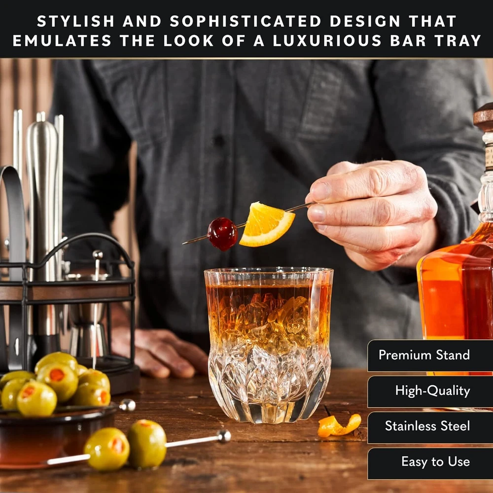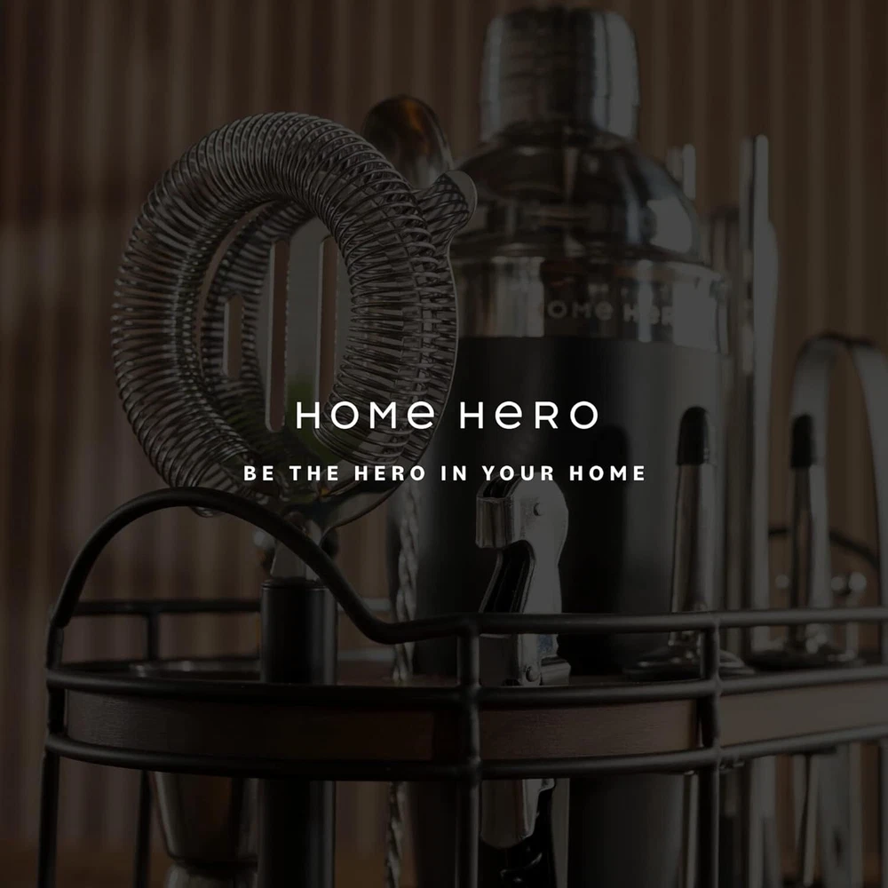 Home Hero 22-Piece Bar Set, Cocktail Shaker, Bartender Kit - Black Product Details Material: 22 Pcs - Silver Brand: Home Hero Color: Black Included Components: ['Cocktail Shaker', 'Hawthorne Strainer', 'Jigger', 'Bar Spoon', 'Muddler', 'Ice tongs', 'Wooden Stand'] Number of Pieces: 22 Manufacturer: Home Hero Package Dimensions: 12.32 x 8.43 x 7.6 inches Item Weight: 4.53 pounds Item model number: Bartender Kit Batteries required: No Included Components: ['Cocktail Shaker', 'Hawthorne Strainer', 'Jigger', 'Bar Spoon', 'Muddler', 'Ice tongs', 'Wooden Stand'] ['Cocktail Shaker', 'Hawthorne Strainer', 'Jigger', 'Bar Spoon', 'Muddler', 'Ice tongs', 'Wooden Stand']['Cocktail Shaker', 'Hawthorne Strainer', 'Jigger', 'Bar Spoon', 'Muddler', 'Ice tongs', 'Wooden Stand'] See more The 22-Piece Ultimate Bar Set - This all-inclusive bartender set is essential to any home bar. We have thoughtfully designed it in-house to include all the bar essentials like, strainers, bar spoons, cocktail shakers, muddlers, ice tongs, and much more. Be assured, your next party is sure to be a success! Includes An Elegant Wooden Stand - This bartender kit includes a beautifully crafted wooden stand that offers classic elegance to your home. Its quality build and sleek design will make this cocktail shaker stand out! Sleek & Classic Design - Our black and silver cocktail kit combines elegance and sophistication perfectly. Not only does it make a stylish statement, but it's also crafted with premium stainless steel materials that will last a long time. Recipe Book Included - Mix up your night with our cocktail bar kit! This fantastic set has all the bar tools necessary for crafting traditional and modern drinks. A helpful recipe book is included with directions for 10 delicious cocktails. Great Gift Idea - Our bartender kit is perfect for cocktail enthusiasts! All the bar accessories for the home bar set are all you need for crafting various drinks. Plus, this cocktail set comes packaged in a beautiful, giftable box.