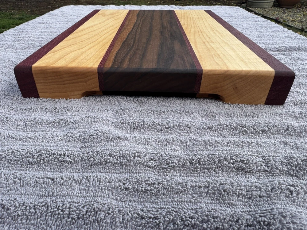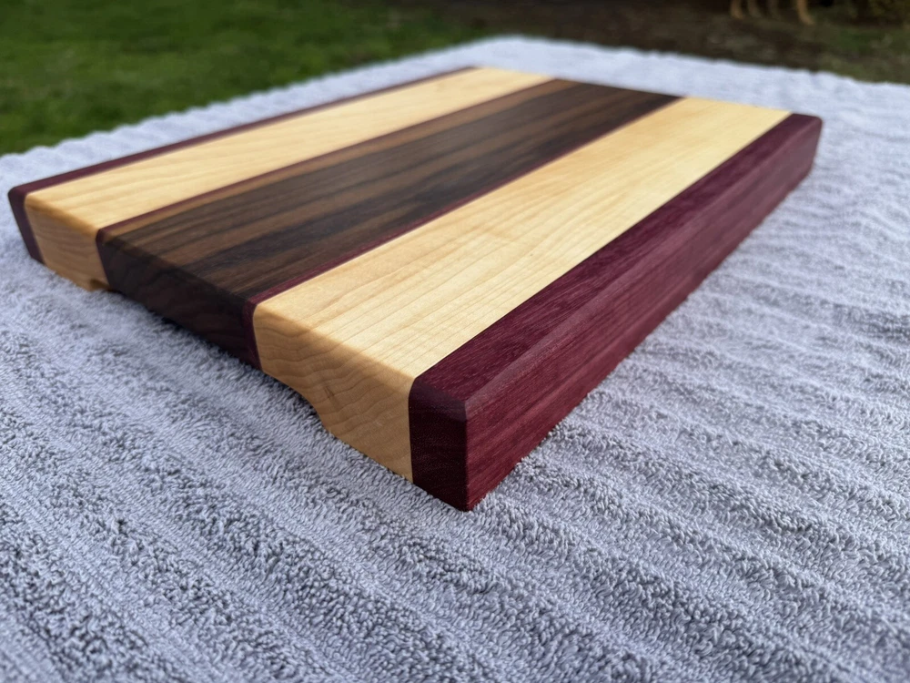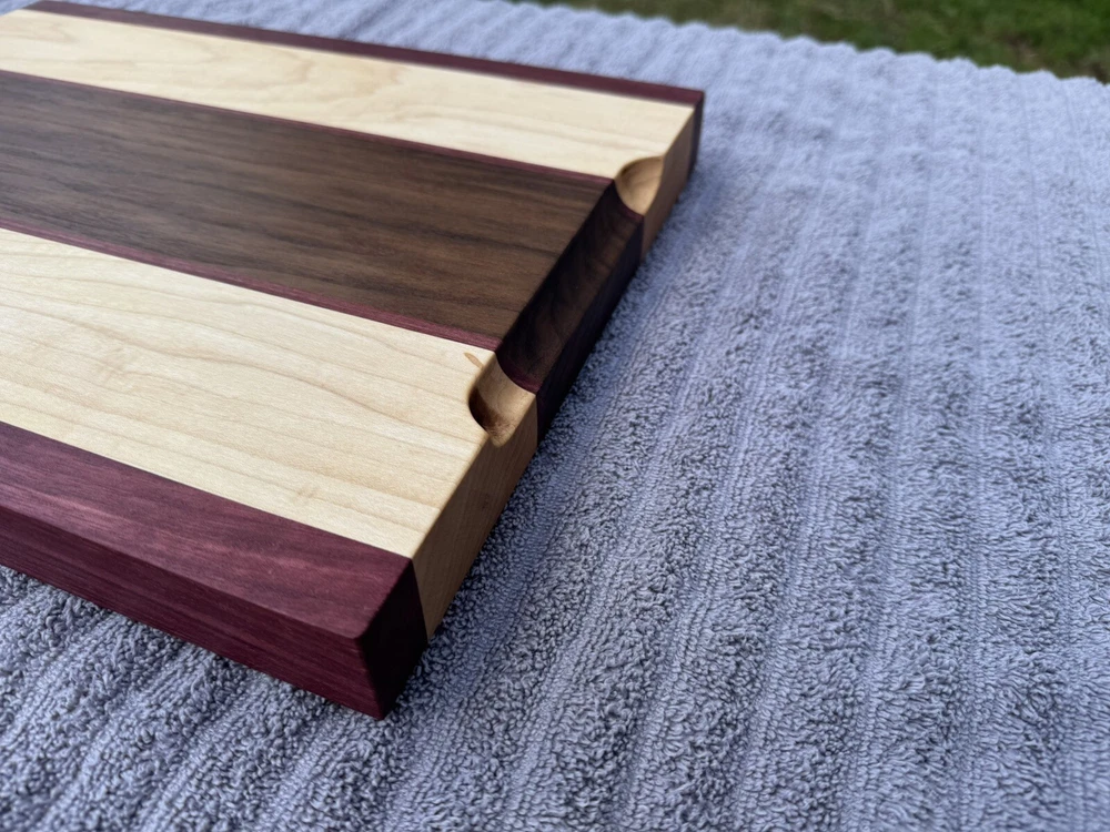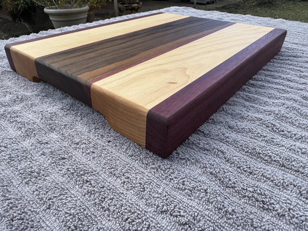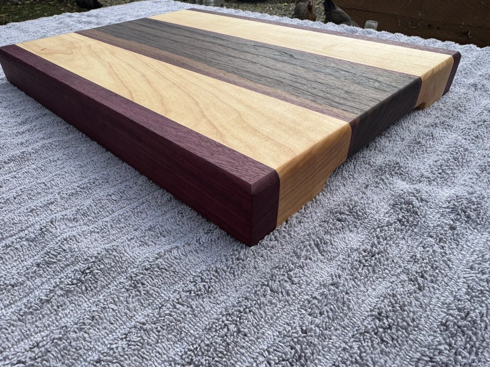 This handcrafted cutting board combines the rich, contrasting tones of black walnut, maple, and purpleheart wood for a striking and functional kitchen piece. -SIZE- L 15.5in W 11.75in H 1.5in All oil and wax used on the cutting boards are food safe and natural. -OIL USED- Bumblechutes woodworkers oil was used. -INGREDIENTS- Coconut Oil, Vitamin E Oil, Mineral Oil, and Lemon Oil. -CONTAINS- Tree Nuts (100% Pure, Fractionated Coconut Oil) -SHOP WAX- Bumblechutes shop wax was used on these cutting boards. -INGREDIENTS- Mineral Oil, Beeswax, Carnuba Wax, Vitamin E Oil, Lemon Oil.