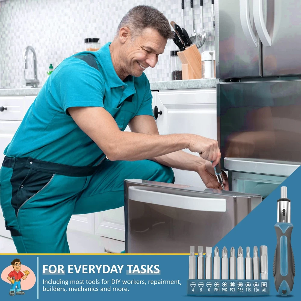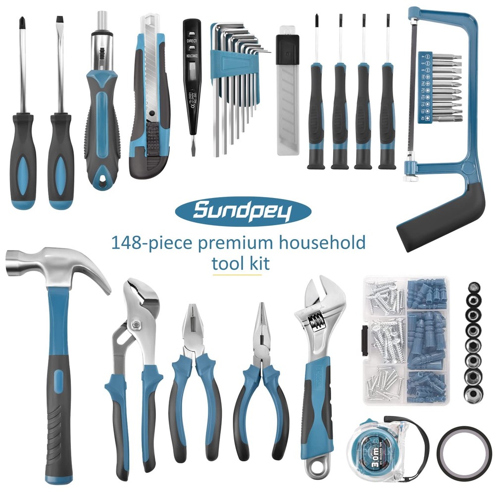 About the 148Pcs home tool kit for handyman is the nice choice to accomplish your general purpose projects, repairs, and maintenance at home, garage, office, shop or dormitory. A Basic house repair tool kit is essential whether you are doing basic DIY work or working household projects. It contains all the basic but necessary tools you will need around your home to assemble furniture, install back yard and patio essentials, hang picture frame, fix simple plumbing issues, repair your bicycle, and a lot more. All the household tool set are packed in a rugged,compact carrying case for storage and portability. Each tool fits snugly into its respective place to prevent moving around and scraping. 【Contain Basic Hand Home Rrepair Tool Set】148pcs homeowner portable travel tool set includes screwdriver bits,voltage tester, slotted screwdriver set, phillips screwdriver set, 10ft tape measure , water pump pliers, 8″ adjustable wrench, 6″ wire pliers, 6″ needle nose pliers etc for regular house indoor/outdoor maintenance. 【Portable Versatile Complete Toolbox】This starter tool sets, suitable for most small maintenance and DIY projects around the house. Work tools set very suitable for DIY enthusiasts, repairers, construction workers, mechanics, body shops etc. A large set of tools can be placed in your home, garage, and office. 【Good Quality Tools kit】 These household tool set are made of good quality steel and forged, polished or galvanized to ensure rust protection and a long service life. Whether you carry out repairs at home or work on hobby projects, this tool set will continue to be used for several years without replacement. 【Sturdy Tool Box】 The storage case independent designed molding box is a one-piece blown box that matches the size of each tool to stabilize tools. Very compact box is easy to transport and carry. It can fix all tools in place to keep work tools clean and tidy. Stable and safe. 【100% Satisfaction Service】 Each tool kit has been tested for safety and standards, durability and functionality according to industry standards. It is an ideal choice for family or as a present to relatives and friends. If you have any questions or problems using this tool box, please let us know. offers you professional and satisfactory solutions. Kindly Tip: When opening the toolbox, please place the side with '''' logo on the top to prevent the tools falling out from the box.