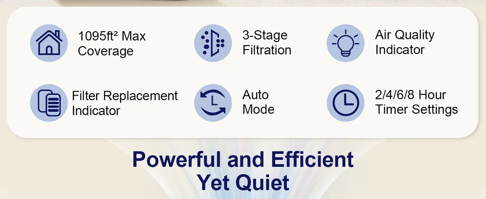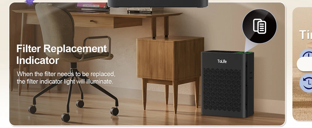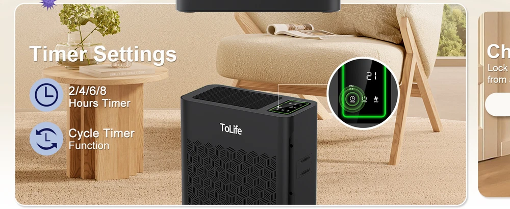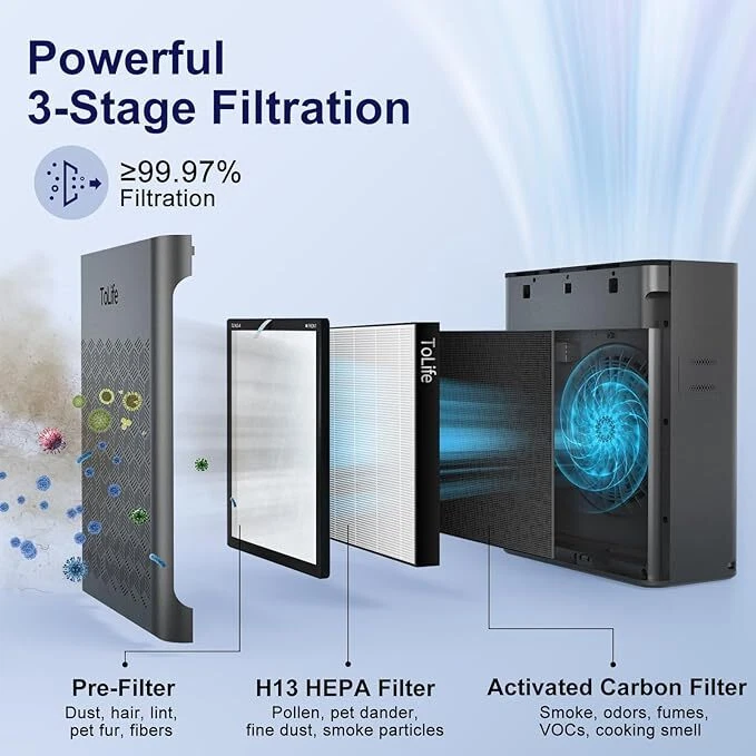 Air Purifiers for Home Large Room Up to 1295 Ft² with PM 2.5 Display Air Quality Sensor, Auto Mode, Timer, HEPA Air Purifier for Bedroom Filters Smoke, Pollen, Pet Dander, Allergies, White About this item The air purifier comes with a filter EFFICIENT H13 PURIFICATION: The air purifier has a powerful filtration system that can remove particles as small as 0.3 microns, including dust and pollen. It can cover up to 1295 sq ft / 120.3 m² and refresh the air in a room every hour SMART AIR PURIFIER: This air purifier has a real-time air quality indicator that shifts from green to yellow or red, automatically adjusting the fan speed. Green means good air quality (low speed), yellow indicates moderate (medium speed), and red signals poor air quality (high speed) ULTIMATE SLEEPING EXPERIENCE: You can choose a low fan speed or the automatic mode according to your preference while sleeping. The lights can be turned off, and the machine runs quietly, ensuring that your beautiful dreams are not disturbed TIMER FUNCTION AND CYCLE TIMER FUNCTION: This product features timer settings for 2, 4, 6, and 8 hours. A long press on the timer button activates a recurring timer, enabling the air purifier to start daily at the same time and turn off after the set duration This Tolife Fresh Air Living HEPA Air Purifier is designed for large rooms up to 1295 square feet. It features True HEPA and Pre-Filter filtration technology to capture allergens, dust, and pollen. The Plug-In unit in gray ABS material operates quietly and is suitable for whole room use in various spaces like bedrooms and living rooms. It effectively removes smoke, mold, odors, and other contaminants for cleaner indoor air. On Jan 13, 2025 at 00:49:41 PST, seller added the following information: