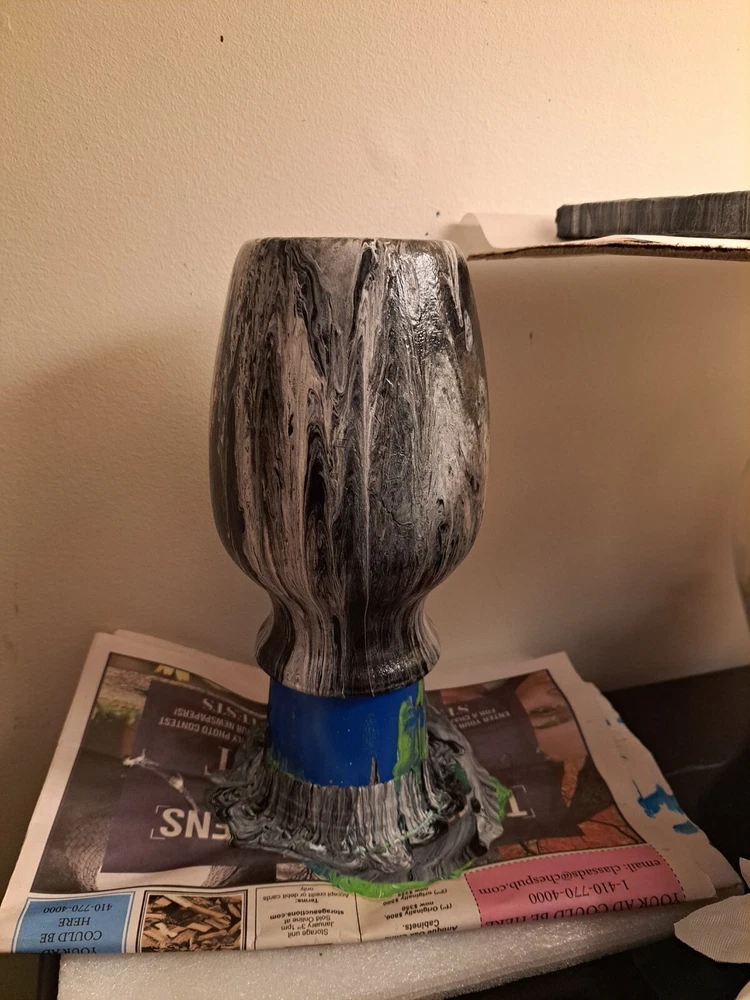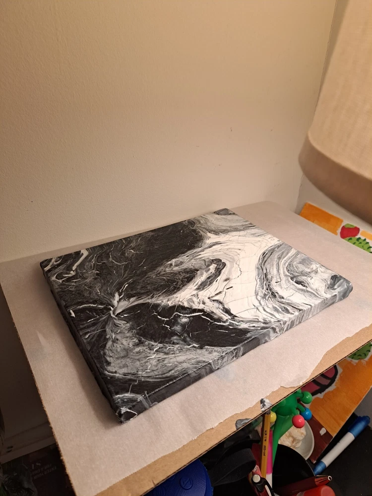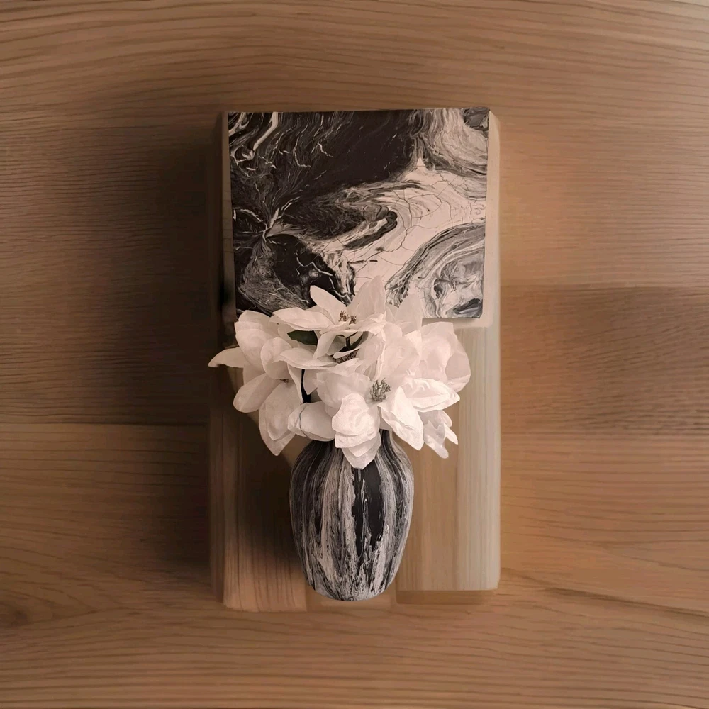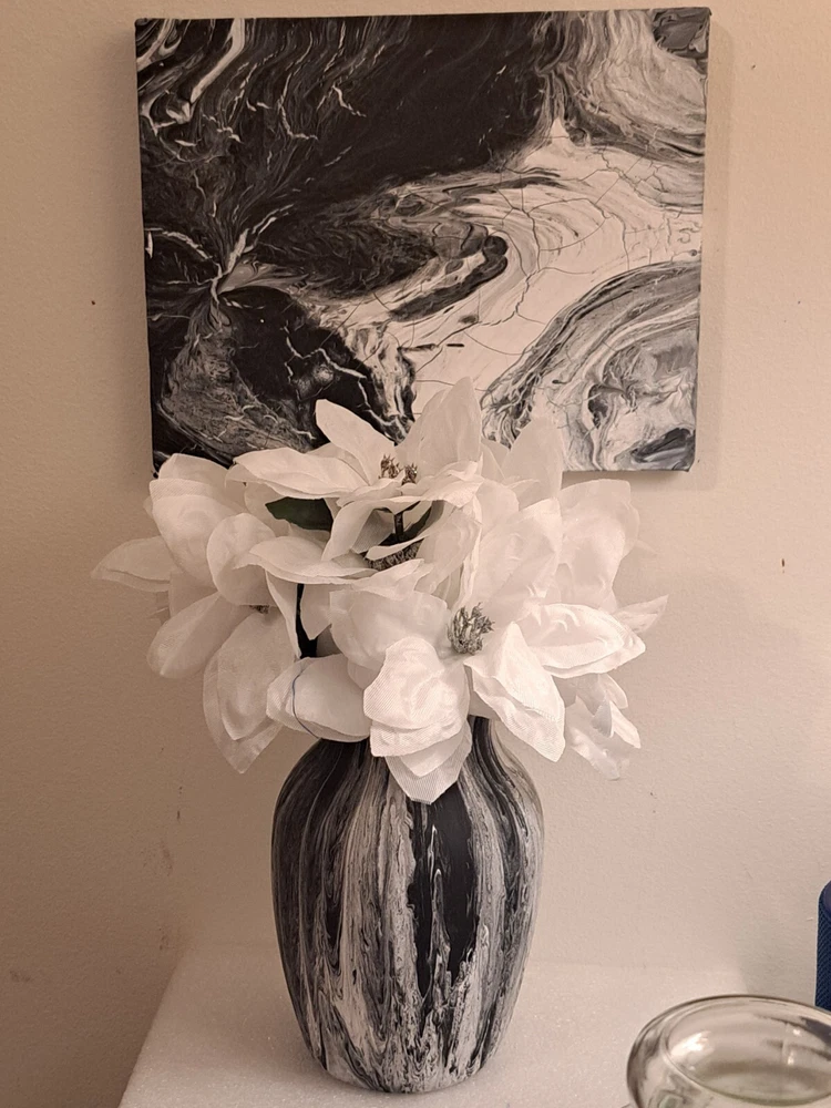 Add a touch of elegance to your home decor with this stunning homemade handpoured painted vase and canvas in black and white. The vase is made of high-quality glass material that gives it a sleek and stylish look. The black and white color combination adds a classic touch to any room in your home. This vase is perfect for displaying your favorite flowers or as a standalone decorative piece. The canvas paints a beautiful picture that complements the vase's design. This is a must-have for any art lover or home decor enthusiast. Video is on Tiktok @namice21.