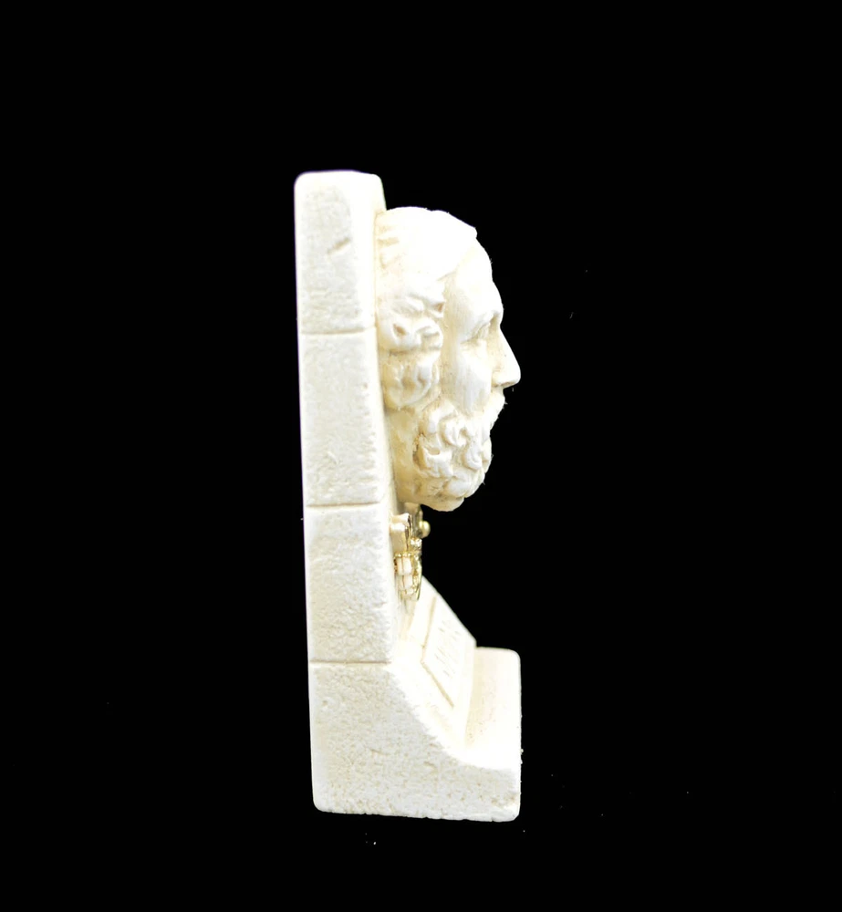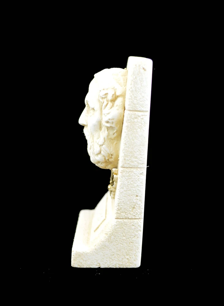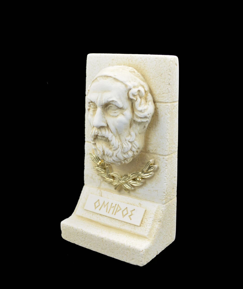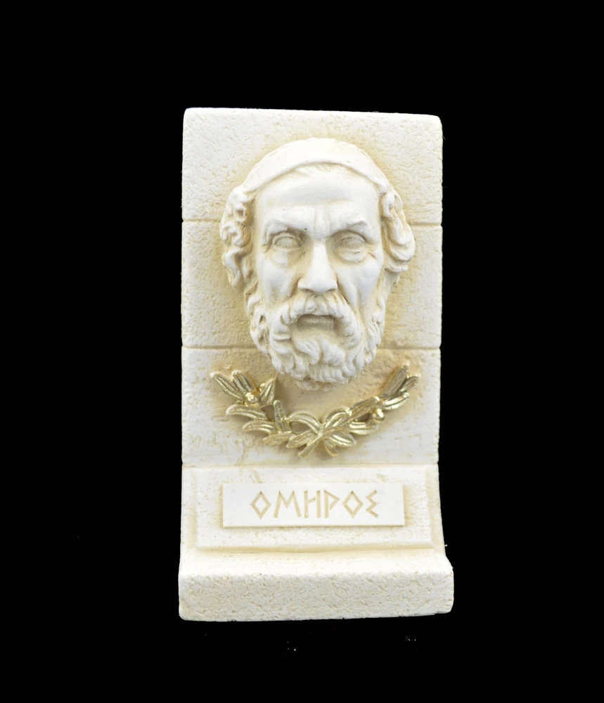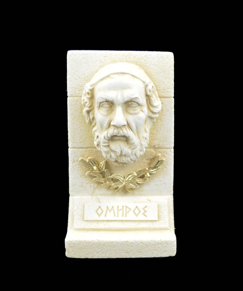HOMERS Quotes: I detest that man who hides one thing in the depths of his heart, and speaks for another. Homer It is equally offensive to speed a guest who would like to stay and to detain one who is anxious to leave. Homer A companion's words of persuasion are effective. Homer, The Iliad A councilor ought not to sleep the whole night through, a man to whom the populace is entrusted, and who has many responsibilities. Homer, The Iliad A generation of men is like a generation of leaves; the wind scatters some leaves upon the ground, while others the burgeoning wood brings forth - and the season of spring comes on. So of men one generation springs forth and another ceases. Homer, The Iliad In the Western classical tradition, Homer (pron.: /ˈhoʊmər/; Greek: Ὅμηρος [hómɛːros], Hómēros) is the author of the Iliad and the Odyssey, and is revered as the greatest of ancient Greek epic poets. These epics lie at the beginning of the Western canon of literature, and have had an enormous influence on the history of literature. When he lived is unknown. Herodotus estimates that Homer lived 400 years before his own time, which would place him at around 850 BC, while other ancient sources claim that he lived much nearer to the supposed time of the Trojan War, in the early 12th century BC. Modern researchers appear to place Homer in the 7th or 8th centuries BC. The formative influence played by the Homeric epics in shaping Greek culture was widely recognized, and Homer was described as the teacher of Greece. Homer's works, which are about fifty percent speeches, provided models in persuasive speaking and writing that were emulated throughout the ancient and medieval Greek worlds. Fragments of Homer account for nearly half of all identifiable Greek literary papyrus finds. (03 00 011) Tracking number provided!!! Details: Condition: New, made in Greece. Approximately Height: 10cm - 3.9 inches Width : 6cm - 2.3 inches Weight: 220g Material: Alabaster patina aged ********