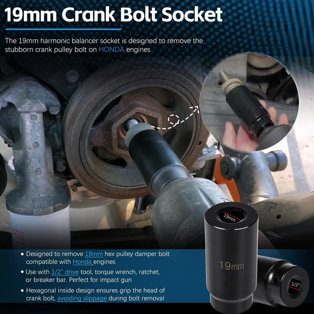 50mm Crankshaft Pulley Wrench Holder Tool--- Used to maintain the harmonic damper pulley in position while removing/installing the pulley bolt on many Acura and Honda engines Use of 50mm Pulley Holder --- Crank Pulley Holding Spanner Tool is used with 1/2" square drive tools. With Hexagonal shape design perfect fits the crank pulley to hold it and prevent it rotating 19mm Harmonic Balancer Socket --Used on Honda engines that use a 19mm hex pulley damper bolt or other 19mm applications. Used with an impact wrench to loosen the crankshaft bolt without holding the crank pulley Use of 19mm Socket --- 19mm Crank Bolt Socket is used with 1/2" drive tool, perfect for impact wrench. Designed with 6-point contact and more than 3 times of the standard socket mass to direct more energy and increase torque to removing the bolt Deep Counter-Weighted Socket --- Reduce the impact losses commonly found in standard socket, allowing break the stubborn crank bolt loose easily What You Get -- 1 x 19mm crank bolt socket; 1 x 50mm Crank pulley holding tool. This compatible with Honda Crank Pulley Tool Set is specially designed for crank bolt removal and installation. Satisfaction Guarantee --- If you're not 100% satisfied with this 19mm weighted socket & 50mm crank pulley holding spanner, simply return it for a full-refund in 30 days. Premium Support & 1-Year Warranty