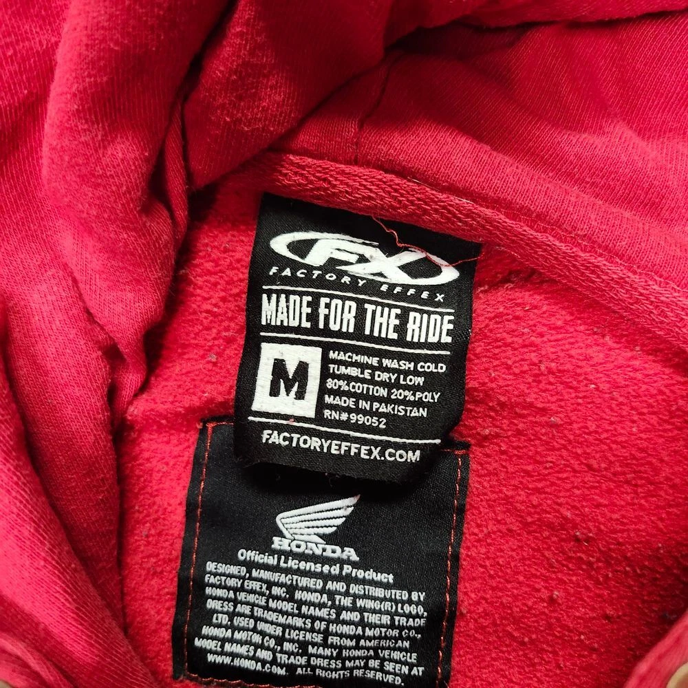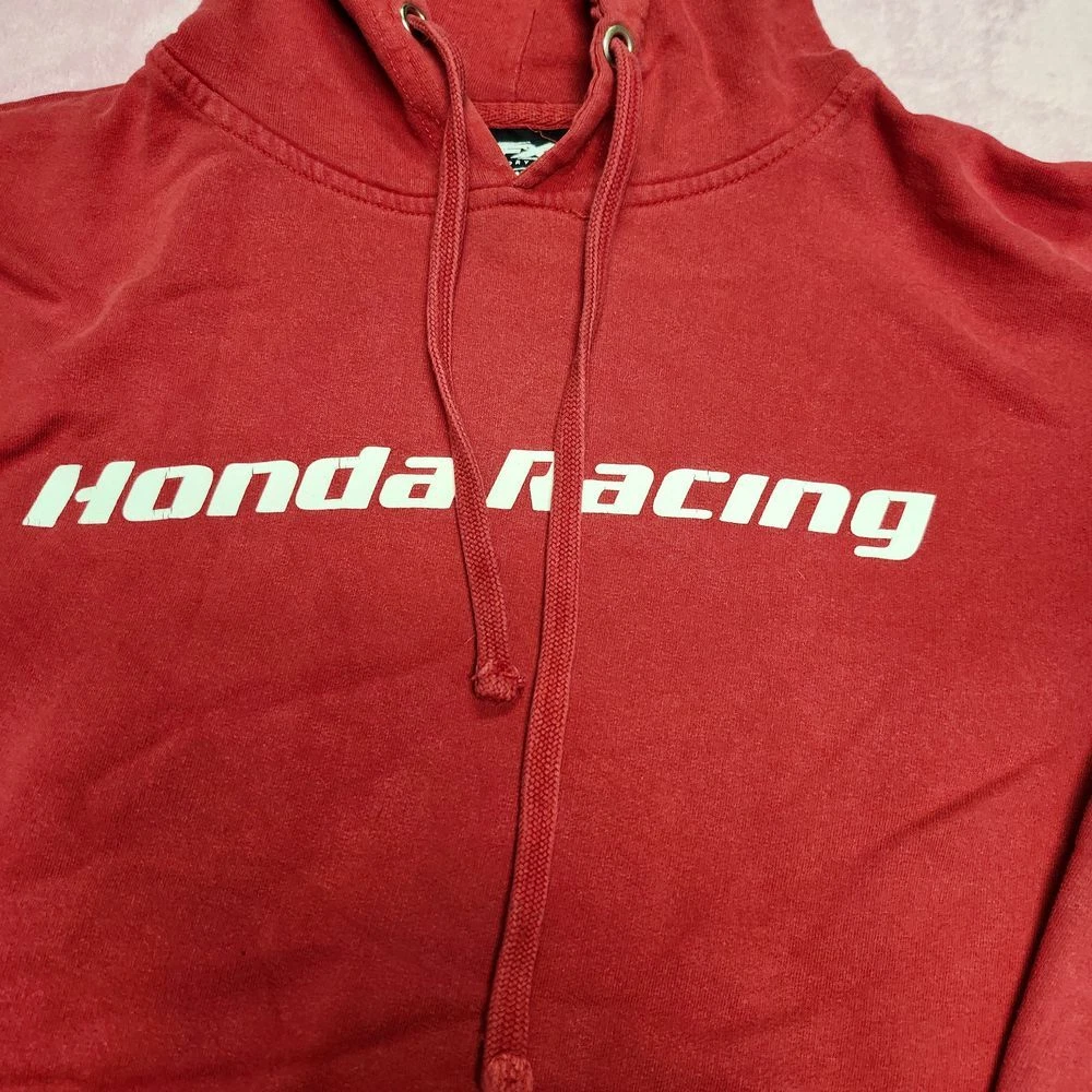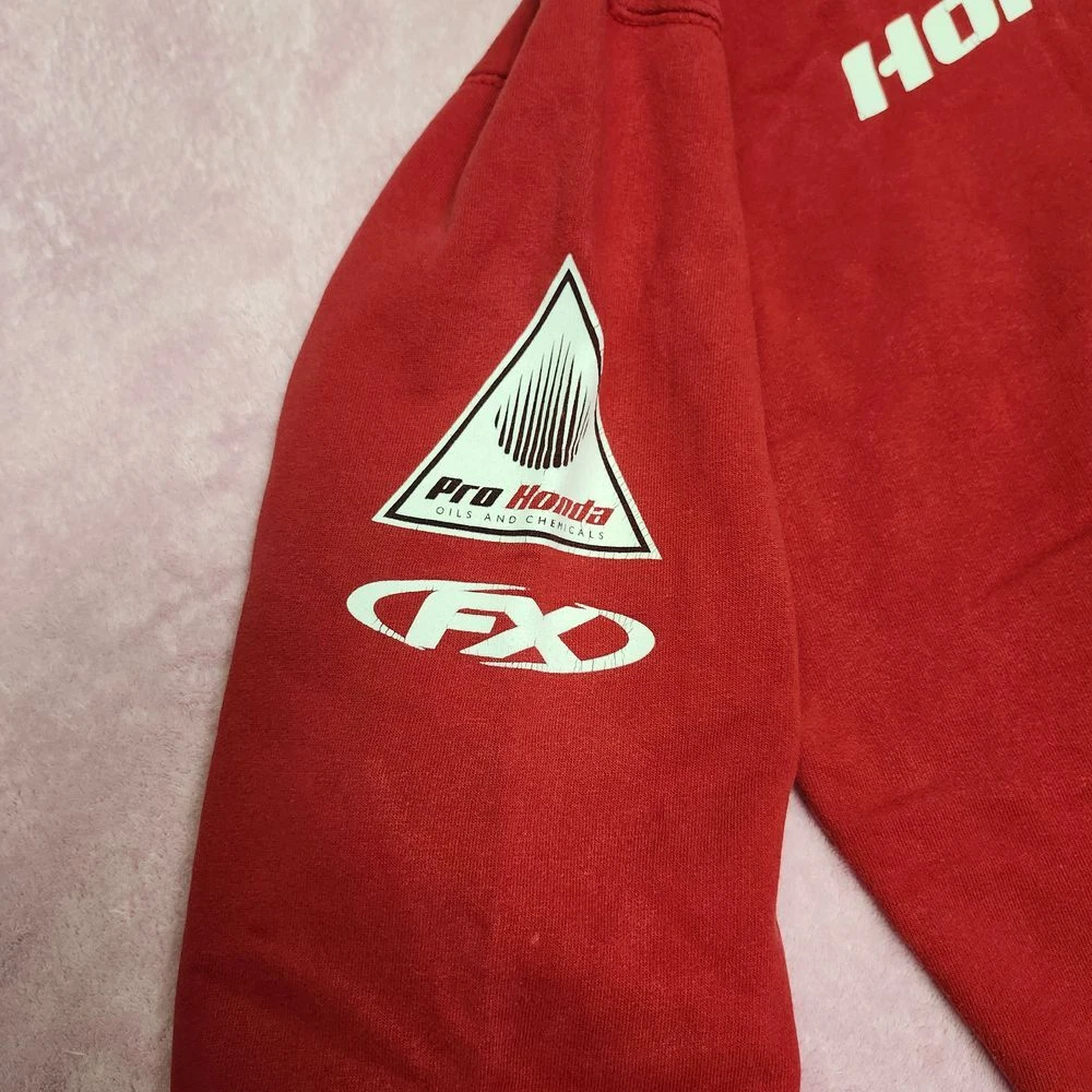 Authentic Honda Racing hoodie featuring bold Pro Circuit FX branding and iconic Honda wing logo. Perfect for motorsport enthusiasts and racing fans. This classic red pullover combines comfort with racing heritage style. Ideal for race day events, casual wear, or showing your passion for Honda motorsports. Features front kangaroo pocket and adjustable drawstring hood. Type: Hoodie Color: Red Department: Men Style: Pullover Features: Hooded, Adjustable, Lightweight Closure: Drawstring Fabric Type: Fleece Performance/Activity: Racing Pattern: Graphic Print Accents: Logo Material: Cotton Blend Keywords: honda racing, pro circuit, motorsport, racing hoodie, pullover, motorcycle, racing apparel, honda wing, fx racing, vintage racing, automotive, streetwear
