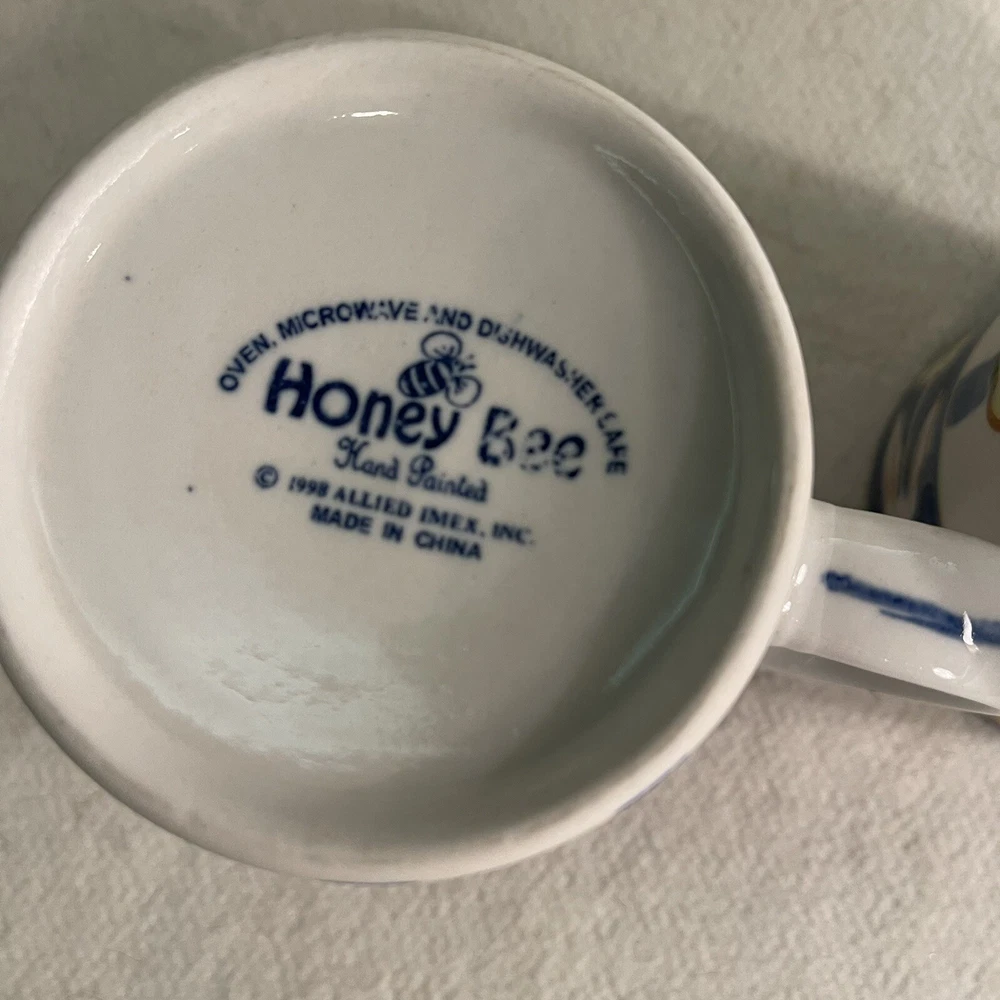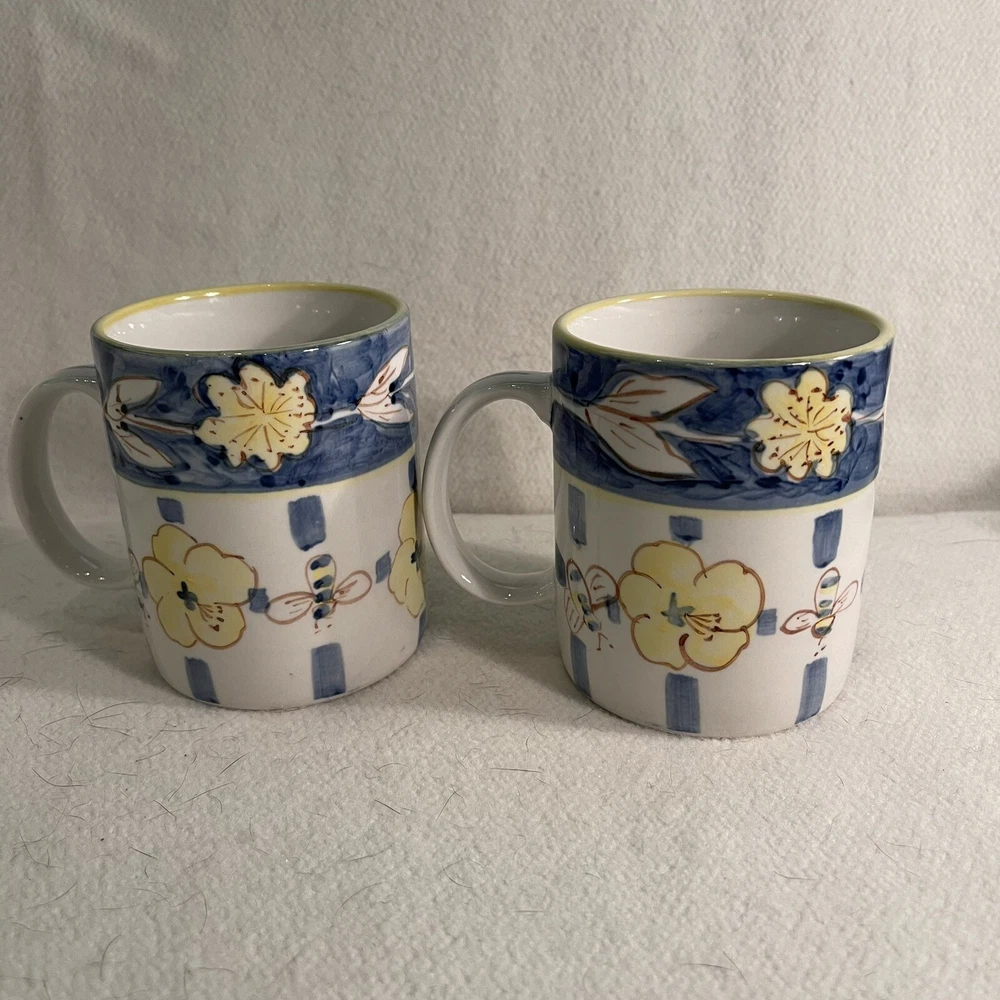 This charming set of two ceramic mugs features a delightful bee flower pattern in shades of yellow and blue. The round shape and contemporary style make them perfect for any coffee or tea lover's collection. These mugs are vintage, manufactured in the 1990s, and weigh a total of 1.1 lbs. The brand is Honey Bee and the item height is 3.75", while the item width is 3.25". These mugs are made of both ceramic and porcelain materials, making them durable and long-lasting. They are perfect for collectors or anyone who loves the bee flower theme. Excellent condition. No chips or cracks.