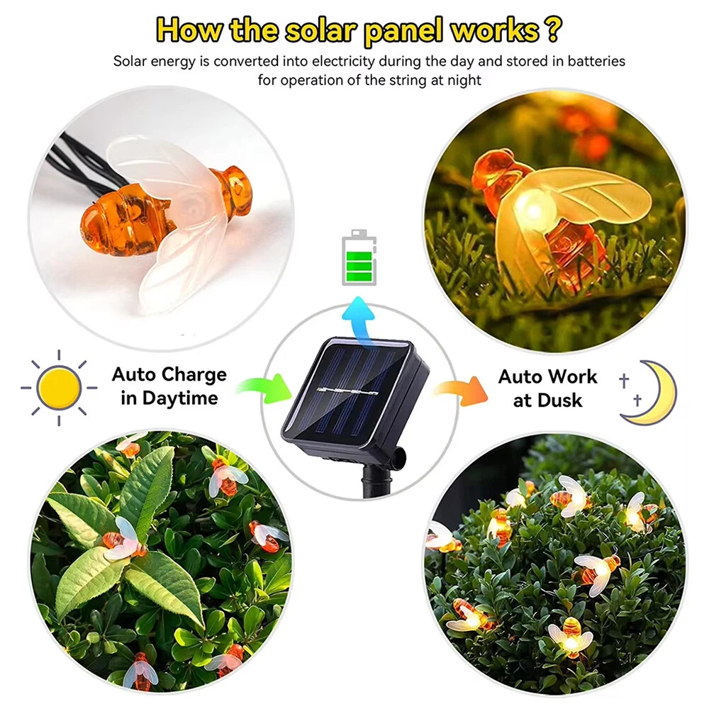 Features: 1. Solar string lights with 30 LEDs, where the LEDs are shaped by highly simulated bee decorations to look like some real bees in your garden. 2. Solar string lights are powered by solar energy and powered by rechargeable batteries, no need for wires and electricity, which can reduce a lot of costs for your home. 3. When you turn on the ON/OFF button, it will automatically light up when the environment is dark and turn off when the sun rises.MODE button can switch the light to 2 different modes. 4. The light string and solar panel are IP65 waterproof. Don't worry about using them in rainy or snowy days. 5. These solar bee string lights glow at night, perfect for decorating your garden, patio, lawn, porch, gate, yard. Specifications: Product Size: 12cm*5cm*3cm Net Weight: 170g Product Appearance: Bee appearance Usage: Outdoor lighting Outdoor lighting Material: plastic Product lamp beads: 30 lamp beads Voltage range: 3v Color temperature: 3000K Package List: Lamp * 1 + ground plug * 1 Notes: 1. Please allow a little error due to manual measurement. Please make sure you don't mind before bidding. 2. Please understand that the color may vary due to the difference of monitors. On Dec 25, 2024 at 01:16:00 PST, seller added the following information: