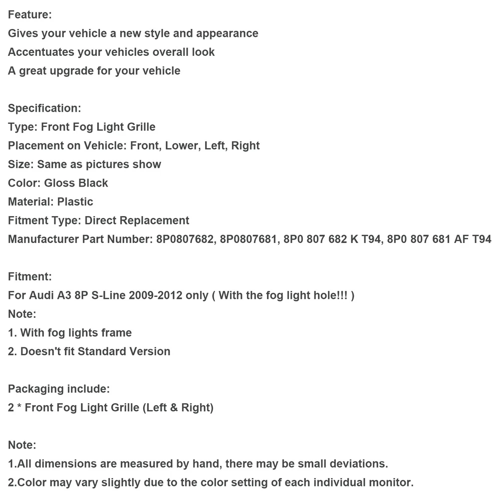SAFE & SECURE SHOPPING 100% SATISFACTION GUARANTEED FAST SHIPPING Store Categories Store Categories Other eBay Motors Grille You may also like Rear/Aux AC Line Set #YSH34913 For Tahoe GMC Yukon Escalade 2015-2020 294.64 USD Free shipping Pair Rear Shock Absorber w/ Electric for Cadillac CTS 09-15 19355570 19355571 !! 340.99 USD Free shipping Gloss Black Front Bumper Grill Grille fit Mini R55-59 Cooper S & JCW US 147.65 USD Free shipping GT Style Front Bumper Grille Fit Mercedes Benz A-Class W177 2019-2021 Black 113.64 USD Free shipping NEW Carburetor 500 CFM Electric Choke 1403 For For Edelbrock Carburetor 303.65 USD Free shipping Rear Trunk Licence Plate Lights Handle Fit Audi A8 A8L A5 A3 Rs5 S5 S8 2008-2019 71.65 USD Free shipping Honeycomb Front Bumper Fog Light Grill Cover Fit Audi A3 8P S-Line 2009-2012 Product Description Feature: Gives your vehicle a new style and appearance Accentuates your vehicles overall look A great upgrade for your vehicle Specification: Type: Front Fog Light Grille Placement on Vehicle: Front, Lower, Left, Right Size: Same as pictures show Color: Gloss Black Material: Plastic Fitment Type: Direct Replacement Manufacturer Part Number: 8P0807682, 8P0807681, 8P0 807 682 K T94, 8P0 807 681 AF T94 Fitment: For Audi A3 8P S-Line 2009-2012 only ( With the fog light hole!!! ) Note: 1. With fog lights frame 2. Doesn't fit Standard Version Packaging include: 2 * Front Fog Light Grille (Left & Right) Note: 1.All dimensions are measured by hand, there may be small deviations. 2.Color may vary slightly due to the color setting of each individual monitor. About Us Shipping Terms Contact Us About Us Bruce & Shark is a company Focus on Motorcycle parts more than 11 years. The design inspiration comes from the awe of the vast sea and worship of the fighting sharks, therefore Bruce & Shark takes a shark as brand logo. Since its inception, we have always put the "customer first" and "top quality" as our principle. We specialized in selling Motorcycle parts and providing customers with various types of high-quality products. Our brand Bruce & Shark has enjoyed good reputation in America, Europe, Japan, Canada and Africa, covering more than 30 countries. Our vision is to deliver high-quality Motorcycle parts products and sincere services to the world. Our main products are motorcycle mounted, fuel pump, stator, windshield, Seat Cover, motorcycle fairing. Welcome to our shop to choose products that are worth more for your Motorcycle! Please Add me to your list of favorite sellers and visit often. Thank you for your business. Shipping Shipping Terms International Buyers – Please Note: 1. Import duties, taxes and charges are not included in the item price or shipping charges. These charges are the buyer’s responsibility. 2. Please check with your country’s customs office to determine what these additional costs will be prior to bidding/buying. 3.Buyers' Information: We strive our best to provide you the most reliable, affordable way of shipping service. But sometimes international delivery is highly depended on the courier company and local customs/duties. If you do not receive your item on time, please sent us ebay message immediately for further assistance. Thank you for your understanding. Terms We stand behind everything that we sell and will do everything possible to assure you are satisfied. When you receive your purchase if you are not 100% satisfied, please sent me ebay message and we will do our best to make you happy. If you still want to return your purchase, simply ship the item(s) back to us and we will refund your original purchase price and the original shipping charge. Buyers are responsible for the postal cost of returning the items. We must be notified of the intent to return your item within 30 days of receiving the item. Items returned must be in the same condition that they were received. How to return 1,Please ask us for return address . 2,Shipping back the package . The RMA#(Return Merchant Authorization Number = Your ebay ID) must be clearly written on the return package ,Otherwise the package will be refused. 3,Sent us the return tracking number. 4,All returns will be inspected prior to a credit being issued. Contact Us Sent ebay message in English If you have any questions, our Customer Service staffs welcome you to sent me ebay message. We strive to answer all questions and resolve any problems as quickly as possible. Business Hours: HongKong Time GMT+8:00 Monday-Saturday 9:00-17:00 Copyright © 2022 Tongtool
