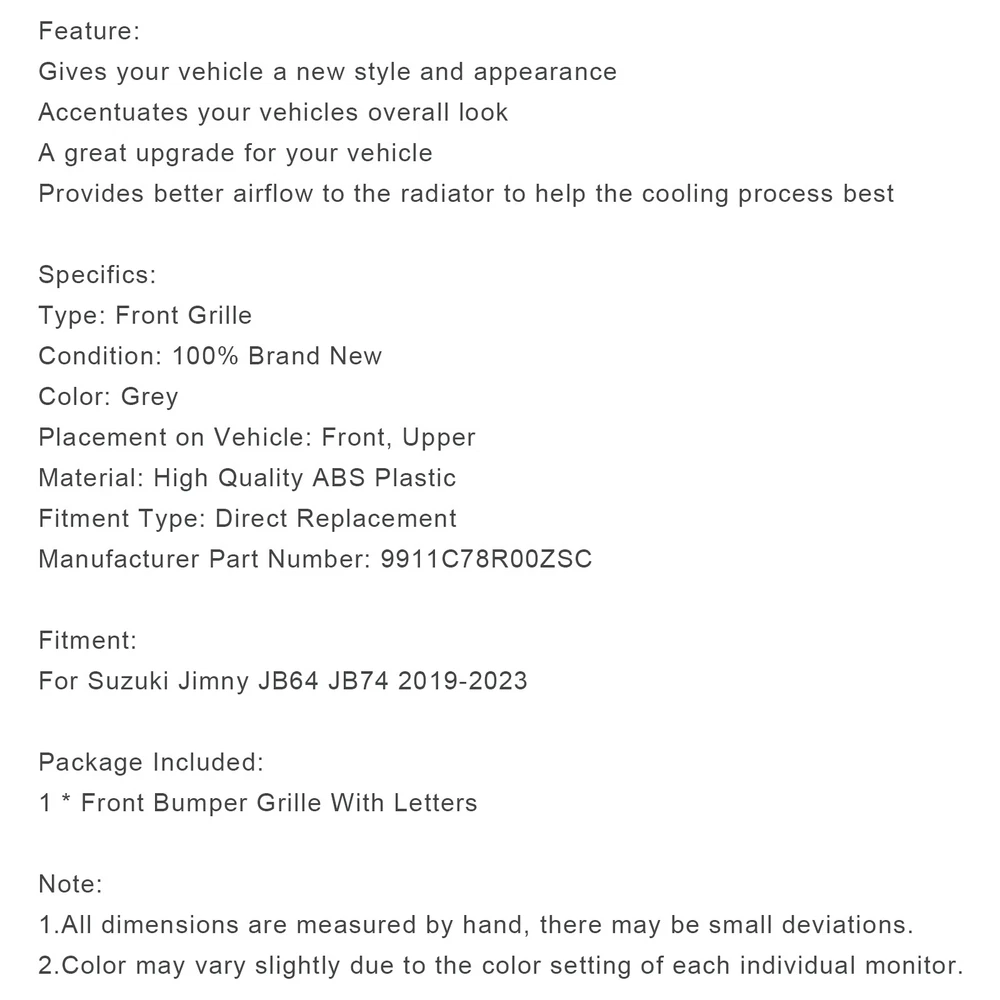SAFE & SECURE SHOPPING 100% SATISFACTION GUARANTEED FAST SHIPPING Store Categories Store Categories Other eBay Motors Grille You may also like ABS Pump Brake Booster Motor Half Assembly 47960-30030 for Toyota 4 RUNNER U4 304.99 USD Free shipping Pair Rear Shock Absorber Struts for Opel Insignia A 2008-2017 436853 436854 382.99 USD Free shipping L+R Pair Rear Bumper Reflector W/ Red Lens No Light For VW Touareg 7L 2002-10 04 50.64 USD Free shipping 4PCS Exterior White Painted Door Handle Set Fit For Silverado 1999-2007 U4 95.99 USD Free shipping 8PCS Fuel Injector 0986435504 Fit GMC Fit Chevy 6.6L Duramax LLY 2004.5-05 U4 1001.65 USD Free shipping Chrome Front Bumper Grille Grill Fit Mercedes CLS C257 W257 Coupe 2018-2024 218.65 USD Free shipping Honeycomb Front Bumper Grill Grille Fit Suzuki Jimny JB74 2019-2023 Grey !!\ Product Description Feature: Gives your vehicle a new style and appearance Accentuates your vehicles overall look A great upgrade for your vehicle Provides better airflow to the radiator to help the cooling process best Specifics: Type: Front Grille Condition: 100% Brand New Color: Grey Placement on Vehicle: Front, Upper Material: High Quality ABS Plastic Fitment Type: Direct Replacement Manufacturer Part Number: 9911C78R00ZSC Fitment: For Suzuki Jimny JB64 JB74 2019-2023 Package Included: 1 * Front Bumper Grille With Letters Note: 1.All dimensions are measured by hand, there may be small deviations. 2.Color may vary slightly due to the color setting of each individual monitor. About Us Shipping Terms Contact Us About Us Bruce & Shark is a company Focus on Motorcycle parts more than 11 years. The design inspiration comes from the awe of the vast sea and worship of the fighting sharks, therefore Bruce & Shark takes a shark as brand logo. Since its inception, we have always put the "customer first" and "top quality" as our principle. We specialized in selling Motorcycle parts and providing customers with various types of high-quality products. Our brand Bruce & Shark has enjoyed good reputation in America, Europe, Japan, Canada and Africa, covering more than 30 countries. Our vision is to deliver high-quality Motorcycle parts products and sincere services to the world. Our main products are motorcycle mounted, fuel pump, stator, windshield, Seat Cover, motorcycle fairing. Welcome to our shop to choose products that are worth more for your Motorcycle! Please Add me to your list of favorite sellers and visit often. Thank you for your business. Shipping Shipping Terms International Buyers – Please Note: 1. Import duties, taxes and charges are not included in the item price or shipping charges. These charges are the buyer’s responsibility. 2. Please check with your country’s customs office to determine what these additional costs will be prior to bidding/buying. 3.Buyers' Information: We strive our best to provide you the most reliable, affordable way of shipping service. But sometimes international delivery is highly depended on the courier company and local customs/duties. If you do not receive your item on time, please sent us ebay message immediately for further assistance. Thank you for your understanding. Terms We stand behind everything that we sell and will do everything possible to assure you are satisfied. When you receive your purchase if you are not 100% satisfied, please sent me ebay message and we will do our best to make you happy. If you still want to return your purchase, simply ship the item(s) back to us and we will refund your original purchase price and the original shipping charge. Buyers are responsible for the postal cost of returning the items. We must be notified of the intent to return your item within 30 days of receiving the item. Items returned must be in the same condition that they were received. How to return 1,Please ask us for return address . 2,Shipping back the package . The RMA#(Return Merchant Authorization Number = Your ebay ID) must be clearly written on the return package ,Otherwise the package will be refused. 3,Sent us the return tracking number. 4,All returns will be inspected prior to a credit being issued. Contact Us Sent ebay message in English If you have any questions, our Customer Service staffs welcome you to sent me ebay message. We strive to answer all questions and resolve any problems as quickly as possible. Business Hours: HongKong Time GMT+8:00 Monday-Saturday 9:00-17:00 Copyright © 2022 Tongtool