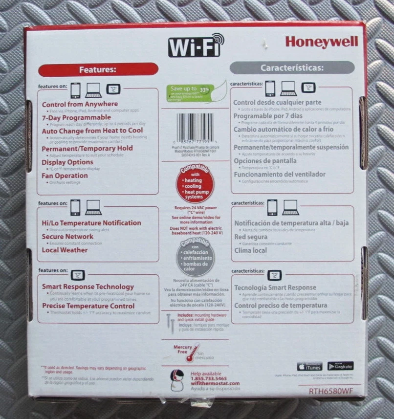 Honeywell Home RTH6580WF Wi-Fi 7-Day Programmable Thermostat New, unused, open box. ENERGY STAR certified. Help save energy, track your heating and cooling with monthly energy reports and get personalized tips on reducing energy use. SAVE ENERGY AND GET REWARDED by checking with your energy provider about available energy savings rebates to save on your purchase (rebate finder link above). Plus, eligible customers can enroll in their local Utility's "DEMAND RESPONSE PROGRAM" which can reward you for allowing the utility to slightly adjust your AC or furnace temperature settings when there is high energy demand. C-WIRE POWER ADAPTER REQUIRED: Before purchasing, check to see if this thermostat is compatible with your home and to determine if your home needs a C-wire power adapter. SMART HOME INTEGRATION. The Wi-Fi 7-Day is compatible with voice assistant devices like Amazon Alexa, Google Assistant, Microsoft Cortana, and more. THERMOSTAT THAT FITS YOUR LIFE. 7-day, 4 periods per day, flexible programming lets you sync your comfort with your schedule. EASY OPERATION AND INTUITIVE. Big, backlit digital display and easy controls make for a user-friendly experience. EASY-TO-USE-APP. Choose from the Total Connect Comfort app or the Resideo app to control your Wi-Fi thermostat anytime, anywhere.
