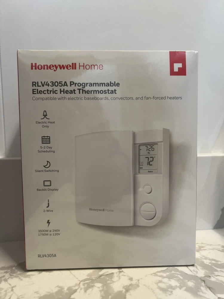 The Honeywell RLV4305A1000/E1 Corded 5-2 Day Programmable Thermostat is a white square-shaped thermostat designed for wall-mounted installation. It is programmable for 5 weekdays and 2 weekend days with 4 periods per day. This thermostat is compatible with baseboard heaters, has a digital display, and operates on 240V line voltage. It features sensor technology for temperature control and comes with switch, push button, touch, and analog/mechanical controls.