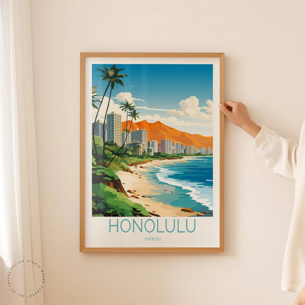 Honolulu Hawaii Travel Poster Hawaii Print Honolulu Hawaii Wall Art Custom Travel Poster Birthday Gifts Wedding Present Material: Premium luster photo paper Print type: Inkjet printing One side printed + The finish provides the highest possible resolution and color saturation + Lasts up to 200 years in color and 400 years in black-and-white + Printed on high-quality resin-coated photo base paper medium + Posters can be hung with double-sided tape, tacks, or framed + Hand washing with a gentle cry cloth is recommended for extended durability I will hand select the best choice of paper for your chosen design to ensure top quality results for a beautiful, bright and luxurious print. All prints are sealed in cellophane slips for protection during transportation, and are shipped in a protective cardboard envelope.