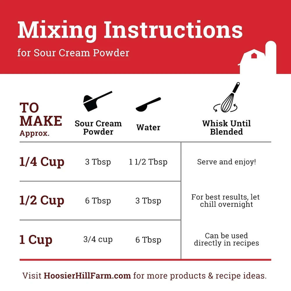 Hoosier Hill Farm Sour Cream Powder, 2LB (Pack of 1) 2 Pound Product Details Is Discontinued By Manufacturer : No Product Dimensions : 4.5 x 4.5 x 8.5 inches; 1 Pounds Item model number : HHF43 Manufacturer : Hoosier Hill Farm Units : 16.0 Ounce Brand: Hoosier Hill Farm Flavor: Sour Cream Item Form: Powder Item Weight: 16 ounces Item dimensions L x W x H: 4.5 x 4.5 x 8.5 inches Try our famous Sour Cream Powder, made from 100% real sour cream. Instantly rehydrate with cool water to get creamy, smooth sour cream. Use to create dips and sauces or add tangy flavor to muffins and cakes. To reconstitute into sour cream: mix 3 parts water with 5 parts Sour Cream Powder Store in a cool, dry place. We do not recommend refrigeration or freezing of the powder Product of the USA Contains milk. Packaged in a facility that processes dairy, soy, peanuts, and wheat products. Try our famous Sour Cream Powder, made from 100% real sour cream. Instantly rehydrate with cool water to get creamy, smooth sour cream. Use to create dips and sauces or add tangy flavor to muffins and cakes. Store in a cool, dry place. We do not recommend refrigeration or freezing of the powder. Contains milk. Packaged in a facility that processes dairy, soy, peanuts, and wheat products.
