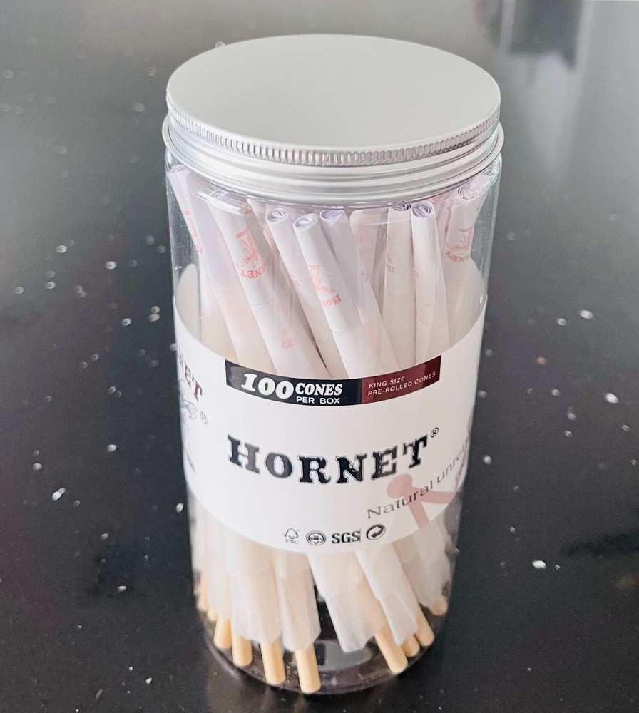 White Hornet Cones Classic King Size: 100 Pack - Pre Rolled Cones with Filter Tips Product Overview Size: 100 Count AUTHORIZED HORNET CONES – CLASSIC KING SIZE: These papers will hold up to 1.5 grams and are 110 mm (4.25 inches) long with a 30 mm tip. PATENTED SLOW BURNING WATERMARK: Each paper has Hornet patented watermark for a slow, even burn of all your prerolls! Don't settle for anything less than the Hornet best! 100% Hornet SATISFACTION GUARANTEE: The Hornet is an authorized Hornet distributor in partnership with the Hornet brand. We will fully refund any customer not 100% satisfied with their purchase no questions asked. What do you have to lose? Add to your cart now! 100% Hornet Satisfaction Guarantee The Hornet is a Hornet Cones distributor in partnership with the Hornet brand. We repackage Hornet into all sizes in order to make them affordable to consumers and producers of any size. We will refund or replace any order that does not meet your expectations no questions asked. Our packaging is recyclable, reusable, and crush-proof. Business done right. What do you have to lose? Order now! Hornet Authentic Patented Slow Burning Watermark Every hornet cone is designed for a slow and and even burn with a criss-cross watermark to ensure no running or canoe-ing of your prerolls. PreRolls Powered by People At the Hornet, we are a Los Angeles based small business that is powered by people to bring you relaxation in the private comfort of your own home. Products for smokers by people who smoke. :) Must be age 21+ to purchase! Ship from California :) & If you have any questions feel free let us know, will respond and resolve it as soon as possible! Your trust is our most precious treasure!