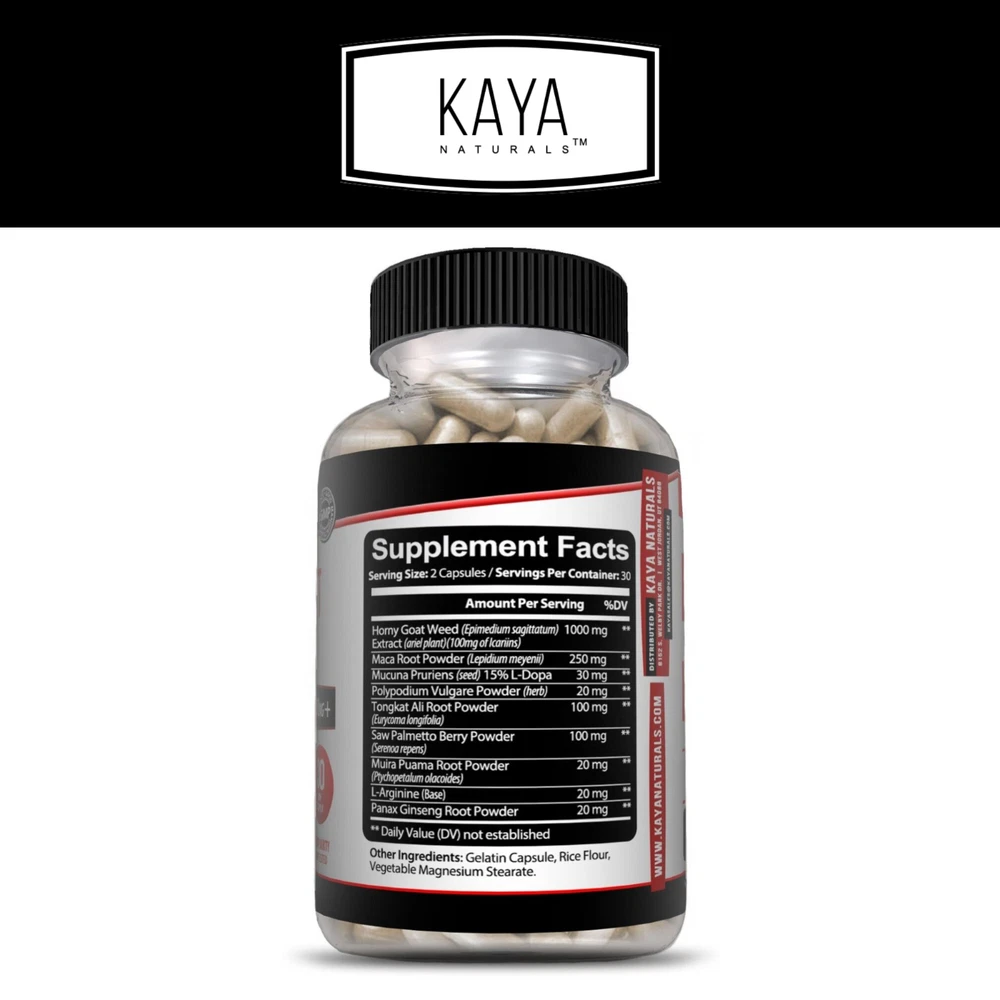 Expiration Date: On Bottle Main Purpose: Libido Enhancement, Potency, Stamina Item Weight: 2.63 oz Brand: Kaya Naturals Features: All Natural, Easy to Swallow, Gluten-Free, GMO-Free, Iron-Free, Shellfish-Free, Sugar-Free, Wheat-Free Country/Region of Manufacture: United States Number of Pills: 60 Formulation: Capsule Department: Men, Unisex, Women Active Ingredients: L-Arginine, Maca, Panax Ginseng, Saw Palmetto MPN: KNHGW60