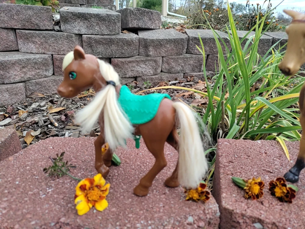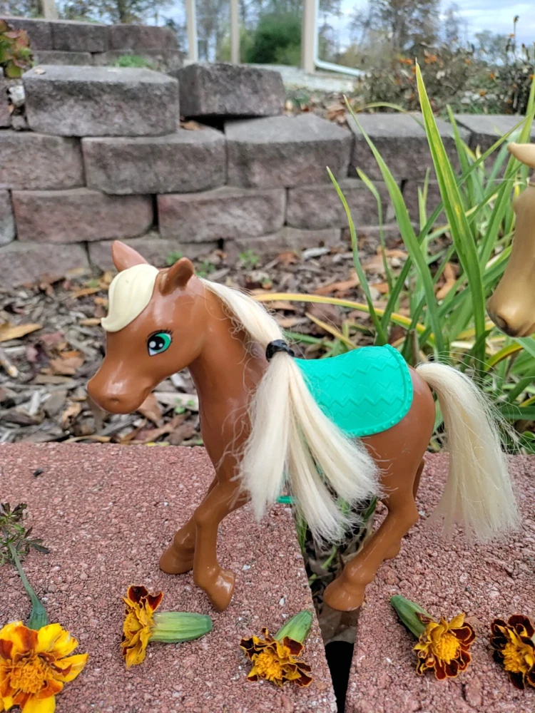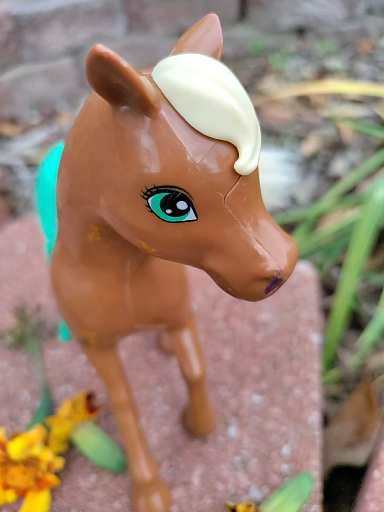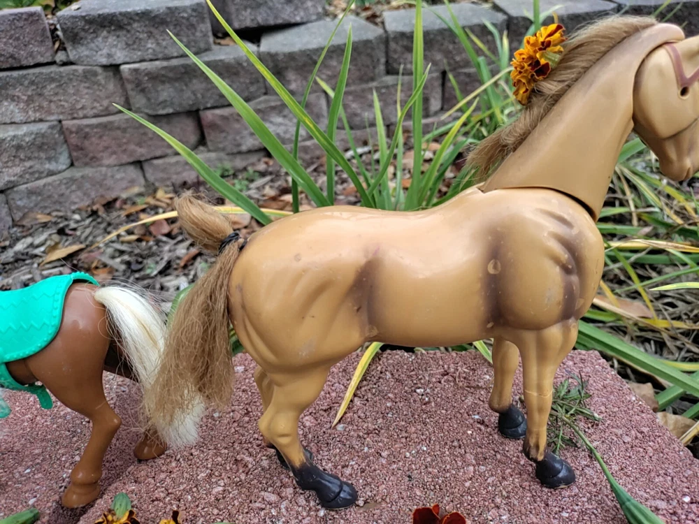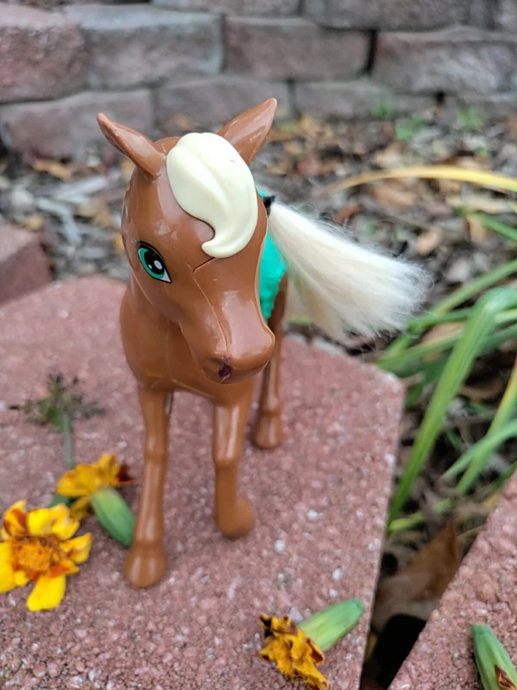 Feast you eyes on this amazing Horse and Foal Lot of Two!! With this amazing lot go on adventures of your own!! This lot includes a horse and a Foal. The horse has some hot glue marks and its hair is frizzy. The sound function does not work because I have not replaced the batteries but it might if replaced. There are also paint marks. But it is in really good condition other than that. Flowers are NOT included. As far as the Foal it is in mint condition with only a paint mark on its muzzle. The saddle is removable and the hair is just a little fuzzy. Their hair is styled too. Thank for checking it out and happy shopping!!