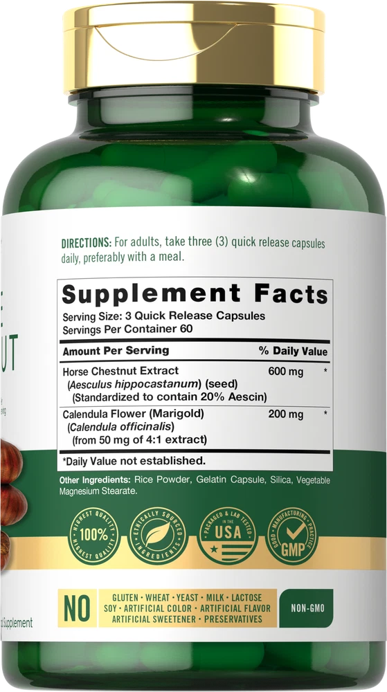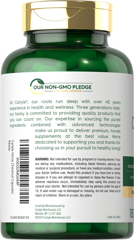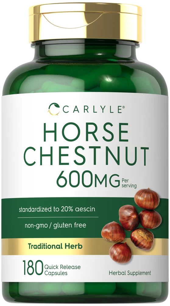 What is Horse Chestnut? Horse Chestnut (Aesculus hippocastanum) is a traditional herb native to a small region in Southeastern Europe. The seed and leaf of this plant are a source of naturally occurring antioxidants, including its main active ingredient, Aescin. An herbal supplement is the best way to add Horse Chestnut extract to your daily wellness tradition. Carlyle Horse Chestnut: At Carlyle, we bring you the most pure and potent form of this traditional herb mother nature can provide. Our Horse Chestnut formula is standardized to contain 20% Aescin, delivering the equivalent of 600 mg per serving in quick-release capsules. Also included is Calendula Marigold Flower for added support, making this herbal supplement one you will not want to be without! Rooted in Wellness: Our expertise in sourcing the purest ingredients combined with advanced technologies makes us proud to deliver premium, honest supplements at the best value. Carlyle Horse Chestnut is a testament to our commitment to excellence, made with powerful ingredients rooted in wellness. Thanks for choosing us in your pursuit of living healthy. Not intended for use by pregnant or nursing women. If you are taking any medications, including blood thinners, planning any medical or surgical procedure, or have any medical condition, consult your doctor before use. Avoid this product if you have liver or kidney disease or if you are allergic to ragweed or daisy-like flowers. If any adverse reactions occur, immediately stop using this product and consult your doctor. Not intended for use by persons under the age of 18. If seal under cap is damaged or missing, do not use. Keep out of reach of children. Store in a cool, dry place.