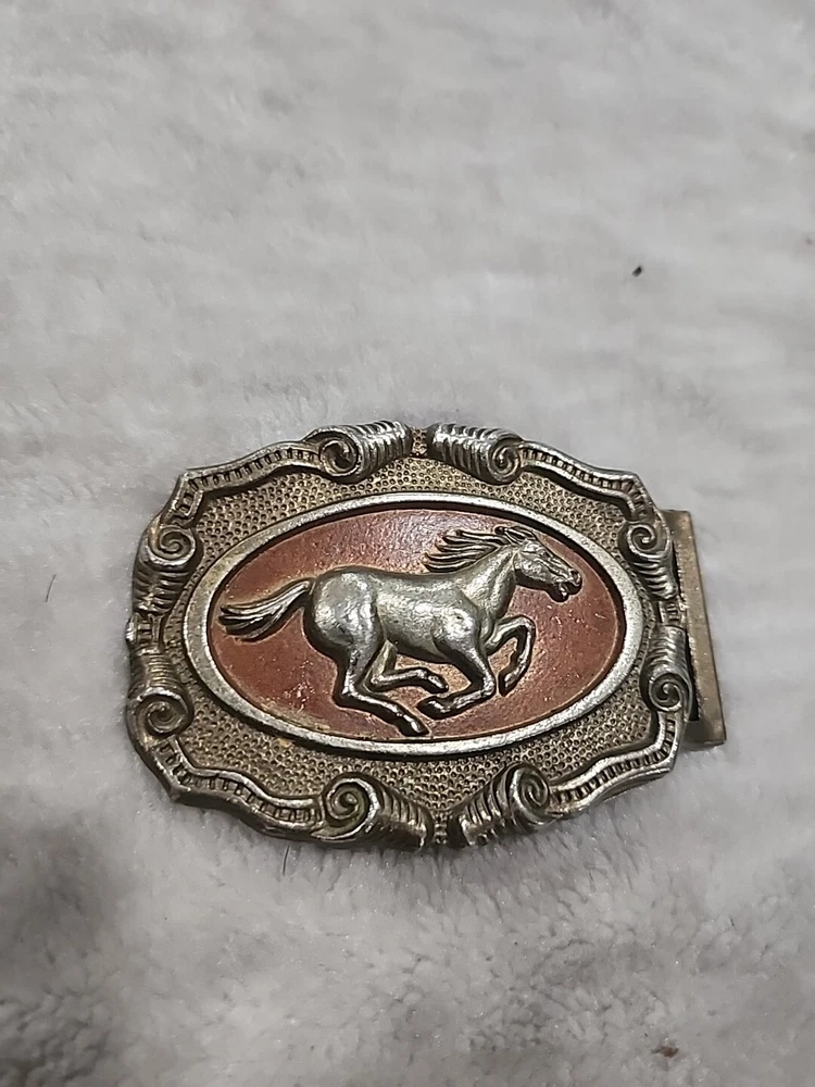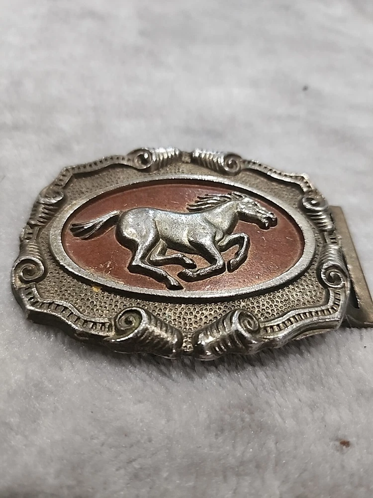 Embrace the spirit of the West with this ornately designed vintage belt buckle, featuring the majestic horse mustang that's come to symbolize American frontier spirit. Crafted in the 1980s, this piece is a true original, reflecting the craftsmanship and design of the era with its intricate metalwork and classic silver hue. Proudly made in the United States, it's a quintessential accessory for enthusiasts of cowboy and Western themes, perfect for adding a touch of vintage flair to any outfit. Its robust material ensures durability, while its unisex design makes it a versatile addition to any collection. Whether you're dressing up for a rodeo or just looking to add some Western charm to your wardrobe, this belt buckle is a timeless choice.