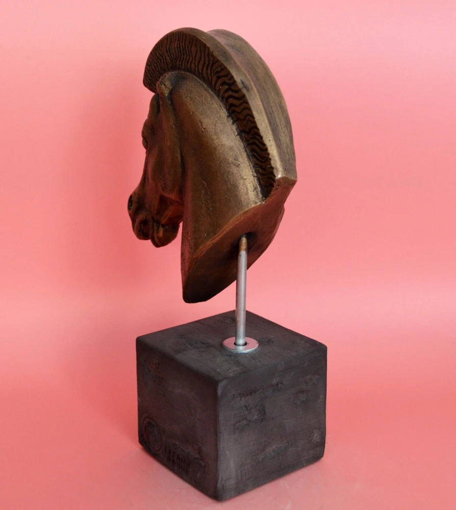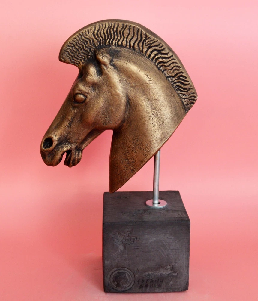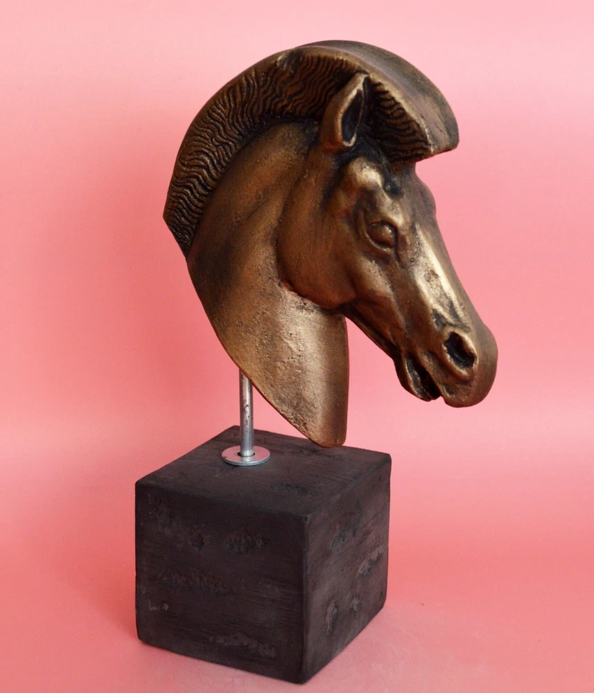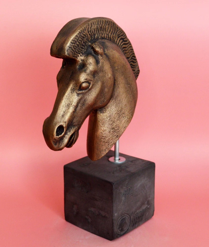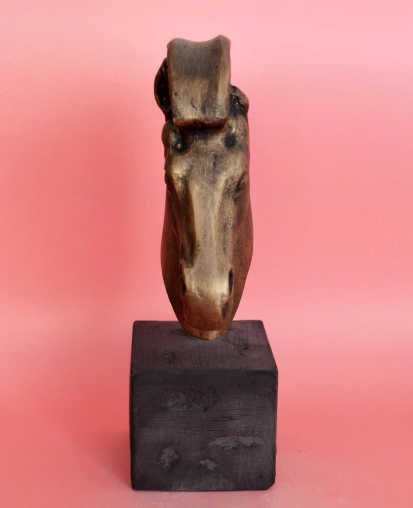 HORSE HEAD SCULPTURE Symbol of wealth and status. Horses were integral to a thriving economy and an essential part of victorious warfare. Figurines have been found in abundance in ancient Greek religious sanctuaries, where they would have been sold to visitors to leave as offerings to the gods. Please be aware that, due to the fact that our products are either individually cast, carved, hand painted and hand finished, there will inevitably be minor variations in size, colour and texture.(B215-P) Details: Condition: New, Handmade in Greece Material: Casting stone Height: 22 cm(8.6 inches) Width: 13 cm(5.1 inches) Weight: 1 kg ********