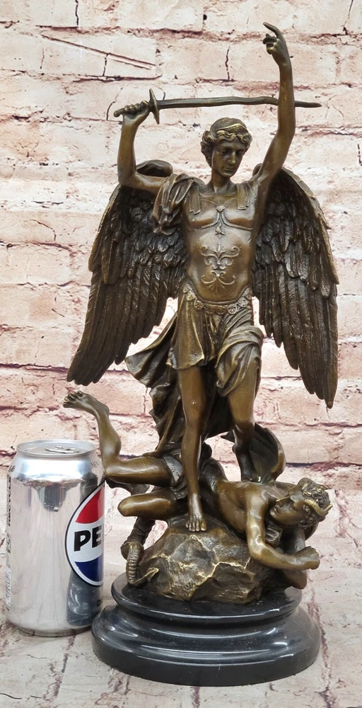Hot Cast Archangel St Saint Michael w/ Shield Sword Color Bronze Figurine Gift Hot Cast Archangel St Saint Michael w/ Shield Sword Color Bronze Figurine Gift Condition : This sculpture is in perfect condition Bronze Dimensions with Marble Base: Height 15.5" X Width 8" Marble Dimensions: Diameter 6" Height without base:14" Weight:14 LBS Inventory:68Y4628286 Mythical Majesty in Bronze: St. Michael Slaying the Dragon This striking bronze sculpture vividly depicts a mythical figure with a dragon's tail, large wings, and a sword, standing tall with one finger raised in the air. The larger figure, exuding an imposing presence, towers over a smaller winged man who appears both frightened and awestruck, seemingly being stepped over by the dominant figure. The interpretation of this dramatic scene is left to the viewer's imagination – does this figure represent good or evil? The powerful stance and fierce appearance certainly suggest a commanding and formidable presence. Craftsmanship and Symbolism Crafted from 100% solid bronze, this sculpture captures the essence of mythological storytelling and artistic mastery. The intricate details of the figures, from the texture of the wings to the tension in their poses, highlight the artist's skill and attention to detail. The larger figure's dominating posture over the smaller winged man evokes a sense of power and conflict, inviting viewers to ponder the underlying narrative. A Statement Piece for Any Space Mounted on a black marble base, the sculpture gains a sense of weight and importance, enhancing its overall impact. Whether you are an art collector, a mythology enthusiast, or simply someone who appreciates the beauty and craftsmanship of bronze sculptures, this piece is sure to impress. It stands as a stunning work of art that adds character and depth to any space it occupies, making it a focal point and conversation starter. Signed Carpeaux Good Vs Evil Angel Striking Devil Bronze Marble Sculpture Statue www.bronzhaus.com Video will open in a new window Using the eBay App? Paste link into a browser window: [isdntekvideo] Shipping Terms : Most of our items are shipped via USPS (United States Postal Service) mail or UPS. Most orders are shipped within 24-48 hours of purchase. Please be aware that not all items are available for USPS shipping due to size and weight. We do ship to Hawaii, Alaska, Canada, Puerto Rico, APO/AE, and U.S. Virgin Islands, however, an additional charge may be required. Please contact us before making any purchases in these areas. For Non-USA customers, you may be responsible for all duty, tax, brokerage fees that may be due upon delivery (shipping costs cover freight charges only). We also ship internationally. Please refer to the "Shipping and Handling" chart for the rates for each area. Payment : We accept just about any form of payment. PayPal, Master Card, Visa or American Express credit cards. Money orders, cashiers checks, and even personal or business checks. For governmental institutions, we will also accept a purchase order. Please understand that for personal or business checks we have to wait for the check to clear (usually 7 days) before shipping. Condition : New Detailed Hand Crafted Hot Cast Bronze Satisfaction Guaranteed. This is Stock Photo, Slight Color Variation!! Listing and template services provided by inkFrog