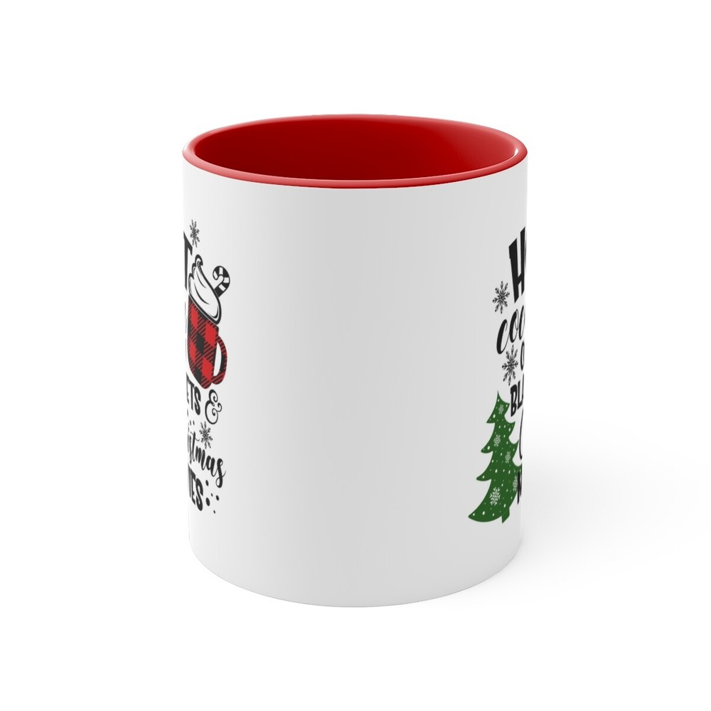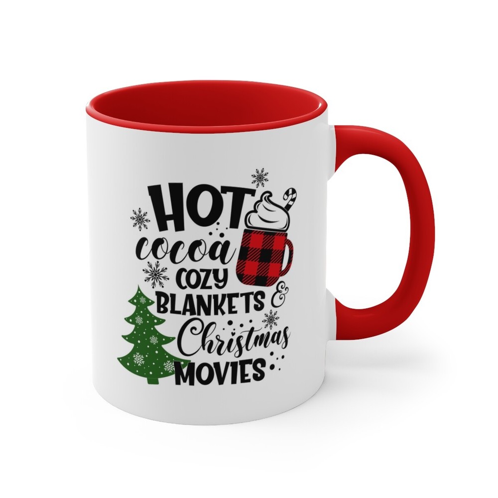 Hot Cocoa Cozy Blankets Christmas Movies Accent Coffee Mug, 11oz Add some color to your routine with this two-tone, custom accent coffee mug. This 11oz mug features an accented C-Handle that is comfortable to use, as well as an accented interior to add more contrast and character. With your design on this mug, you get an instant winner of a product. .: White ceramic with colored interior and handle .: C-handle .: Eye-catching color contrast Image by [JenAs / Shutterstock]