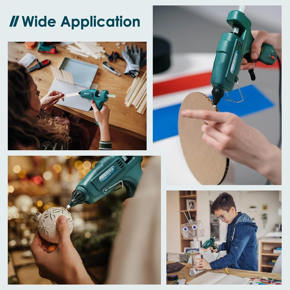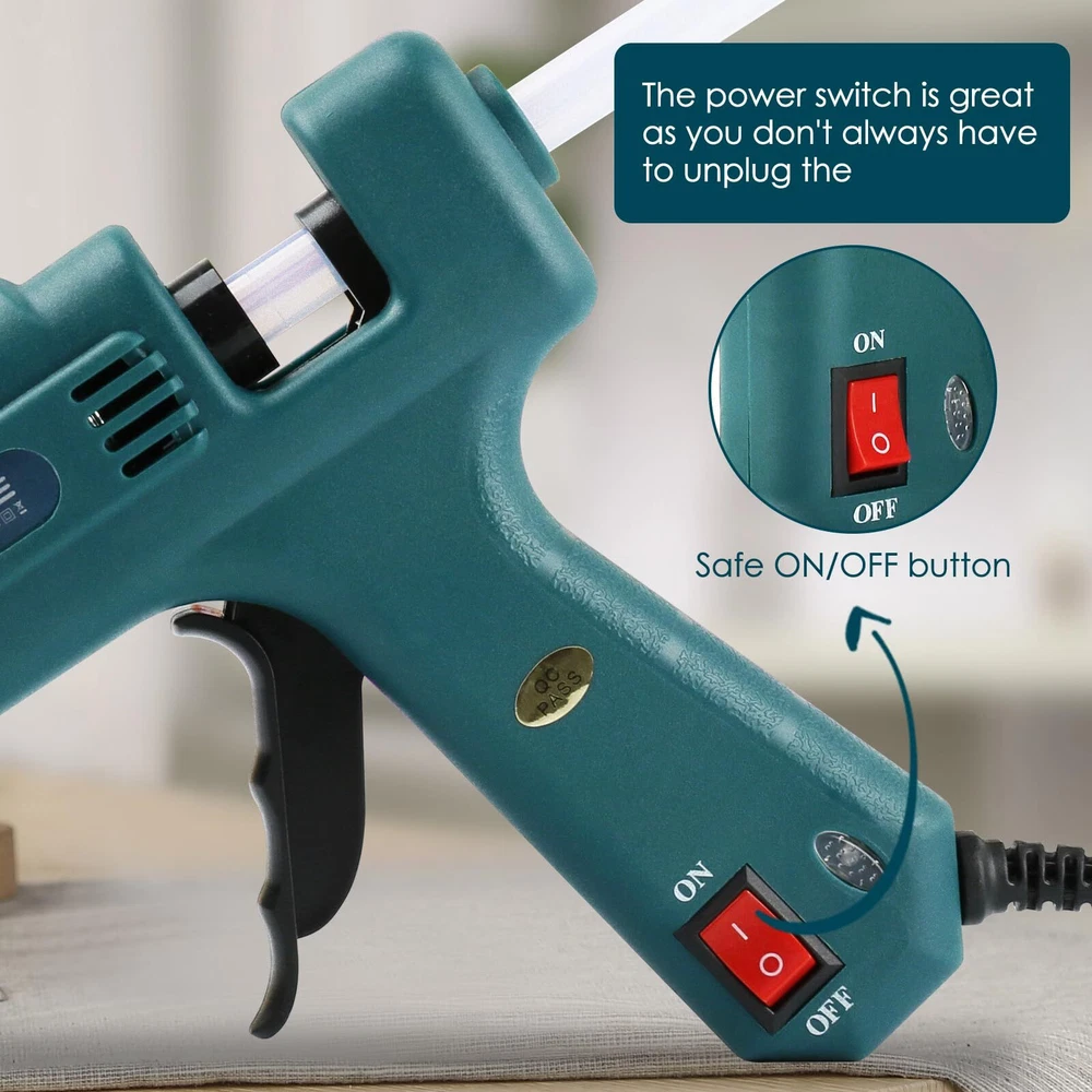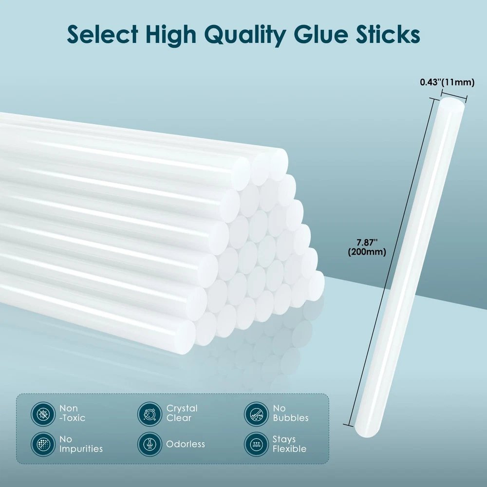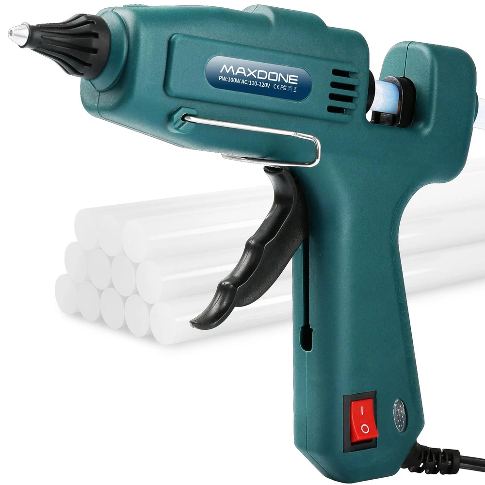 hot glue gun with glue sticks glue gun for craft DIY art 3Mins Instant heat up glue gun kit: This 100W glue gun offers fast heating of 3mins. And our hot glue gun with 12pcs glue sticks(11mm*200mm or 0.43''*8") keeps in high temp and produces consistent strong-adhesive glue stream with minimum energy consumption, helping you finish your work easily and quickly. More professional large glue gun: This full-size hot glue gun is compatible with 0.39-0.43 inch diameter glue sticks. Compared with the other mini glue gun, our adjustable glue gun kit is more professional and perfect for industrial tasks, repairing wood DIY craft, quick home repairs, creative school arts, personalized DIY gifts crafts, and any large projects. Extended Trigger: This glue gun's extended trigger provides an ergonomic grip, reducing fatigue during use. It offers better glue control and keeps your hand safe. A comfortable grip enables faster, precise work, saving time and energy. Perfect ergonomic design hot glue gun kit: The custom mold makes your full size glue gun more unique and stylish. The ergonomic slip-proof grip allows you to firmly handle it with incredible comfort. The high-quality nozzle and trigger ensure precise control. Warm prompt:Keep clean of the glue sticks to avoid impurity blocking the nozzle, and do not pull out of the remanent glue sticks after every use.