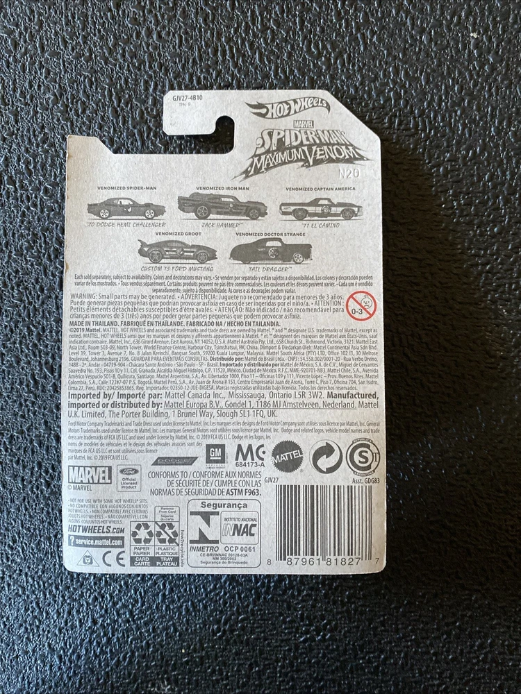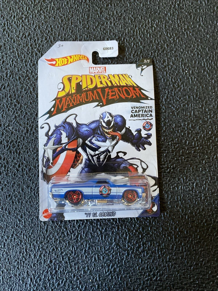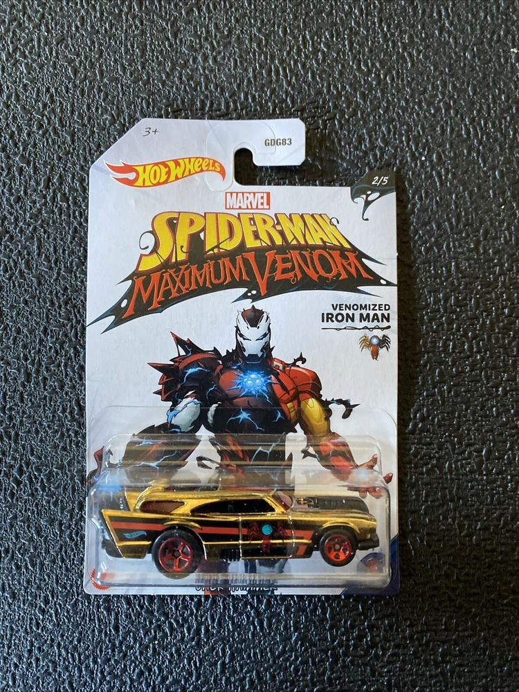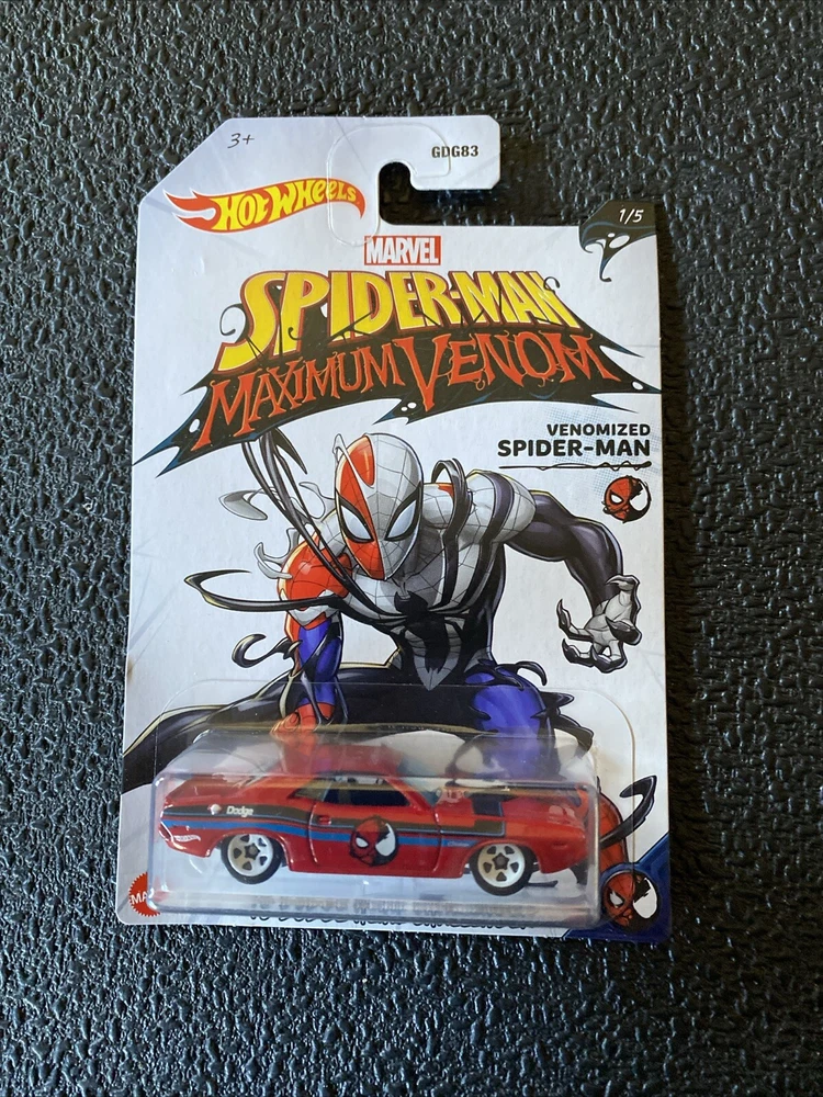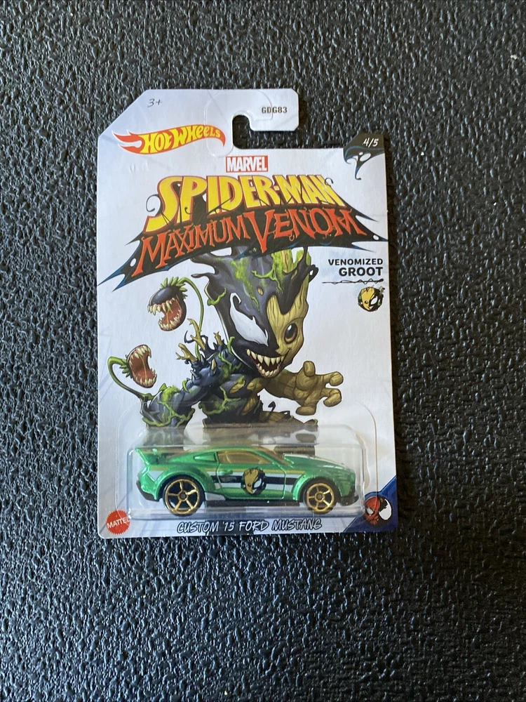 This is a Hot Wheels 2020 Marvel Spider-Man Maximum Venom 1:64 Diecast Set of 5. The set includes five cars, each featuring a different character from the Marvel universe. The cars are made of diecast material and come in an unopened box. The set is part of the Hot Wheels Marvel series and is a great addition to any fan's collection. 1. Venomized Spider-Man / 70 Dodge Hemi Challenger 2. Venomized Iron Man / Jack Hammer 3. Venomized Captain America / 71 El Camino 4. Venomized Groot / Custom 15 Ford Mustang 5. Venomized Dr. Strange / Tail Dragger