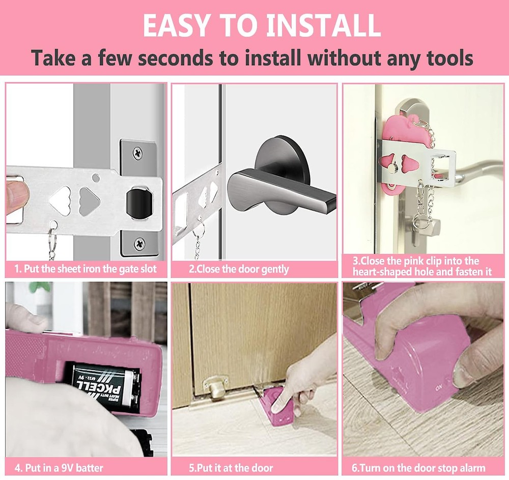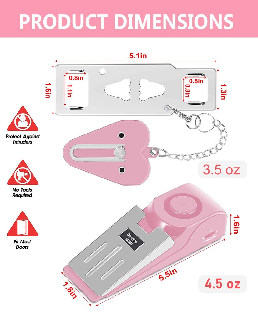The door stopper alarm need battery-operated that itโs requires 1 X 9V battery (package not included) Package: 1X Door Stopper Alarm (without battery), 1 X portable door lock. Why do we need to have Dual Protection Security Door Kit? Are you worried about the insecurity in a hotel and fear of strangers opening your room? So, imagine, youโre alone at home or in a hotel or room or rentals, sometimes the door lock does not work efficiently. Don't worry, if you have Our Security Door Kit, it will prevent unauthorized entry, provide absolute security and privacy of your room and peace of mind in those situations. Notes: ๐1. Place it under the door, the gap between the bottom of the door and the floor should be 10MM(0.38 in) to 30MM(1.35 in). ๐2. Smooth floor can try to use H-type sensitivity, vibration-sensing alarm. ๐3. When the alarm sound gradually becomes smaller, it means to replace the new battery. ๐4. Turn off the power supply can be used as a doorstop. ๐5.Heavy Duty Travel Door Lock has two different sizes of locking holes: 0.78 inches fitting normal doors, 1.2 inches fitting doors with larger bolts, it might doesnโt work on all door, please chick out the size of your door before buy it(you can chick the size in the picture 2) ๐6.portable add lock can only be used for in-swinging hinged door Dual Protection 1:This portable door lock provides you with extra security and privacy, greatly improving your security and preventing unauthorized entry, so the door can't be opened from the outside, not even with a key; which is a great helper for you when you are on business and trips, or live alone Dual Protection 2: the door stopper alarm with 120DB siren, Once someone opens the door, the door stopper alarm will go off in the first place, they will scaring away bad guys and helps wake you and give you time to find help.Require one 9v battery (Not include) EASY TO USE: Easy to install or remove, Our Security Door lock Kit can be installed in seconds without any tools, Perfect for hotels, dormitories, apartments, short-term rentals,bathrooms, bedrooms, or private rooms. It may also be applied to avoid pets going out, and also to prevent children from opening their doors to strangers HIGH-QUALITY MATERIAL&EXCELLENT SERVICE:We guarantee the high quality of Dual Protection Security Door Kit, but if you don't like it or encounter problems in use, we will reply you within 24 hours and negotiate a suitable plan for you. Package Include:1x Door Stop Alarm,1xPortable Door Lock,1x Instructions,1x Storage bag,1xGift Package