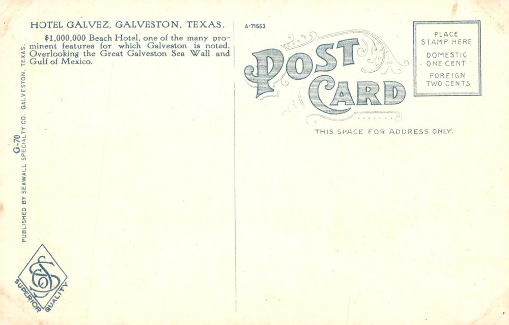 Hotel Galvez, a $1,000,000 beach hotel, overlooking the Great Galveston Sea Wall and Gulf of Mexico, is a prominent feature of Galveston.