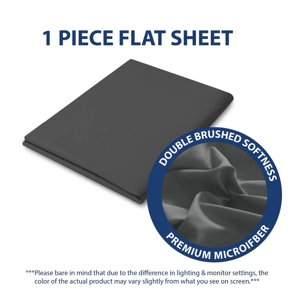 A good night's sleep starts with the right bedding, and sometimes, you find yourself in need of replacing only part of that bedding. Why pay for a whole new set when only piece is ripped, stained, or simply worn out ? With this great deal on a single flat sheet, you don't have to ! The super-soft and silky-smooth feel microfiber fabric is hypoallergenic, and its array of solid colors allows you to match the rest of your existing bedding or shake things up with a coordinating hue. WHAT’S INCLUDED - Twin size: 1 Flat Sheet 66" x 96". IRRESISTIBLE BEDDING - This beautiful flat sheet will enhance the comfort of your bed and the style of your bedroom. Made of 100% double brushed microfiber, it is lightweight, durable, and buttery soft. *Microfiber is an umbrella term for ultra-fine synthetic fibers that are commonly made from polyester and polyamide. HOME ESSENTIALS - Available in a wide assortment of vivid color options ranging from neutral to bold, this flat sheet, suits any style. *Please bear in mind that due to the difference in lighting and monitor settings, the color of the actual product may vary slightly from what you see on screen. EASY CARE - They are also machine washable and quick drying for easy care. OEKO-TEX CERTIFIED - Tested and certified to be free from harmful chemicals, the sheets meet high safety standards.