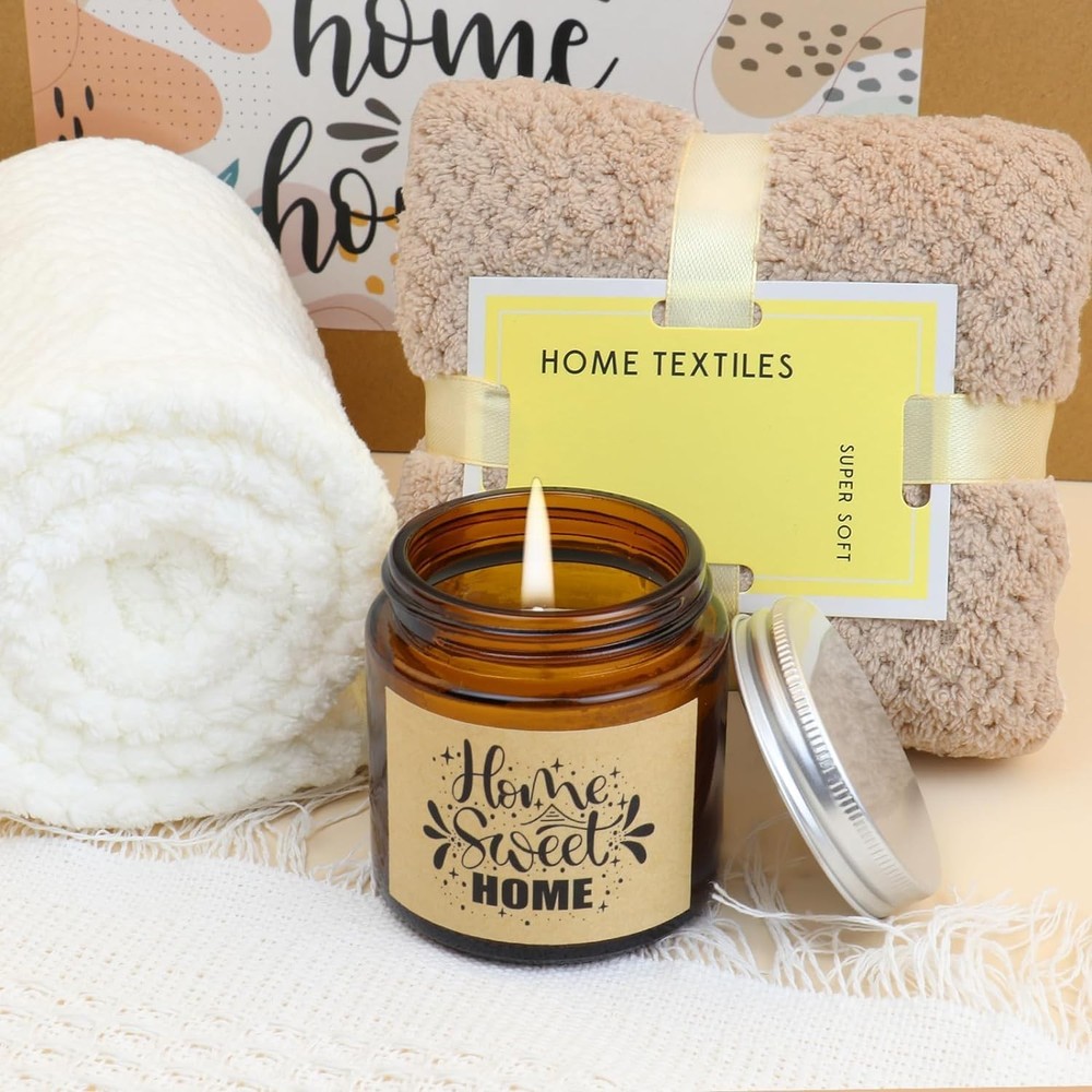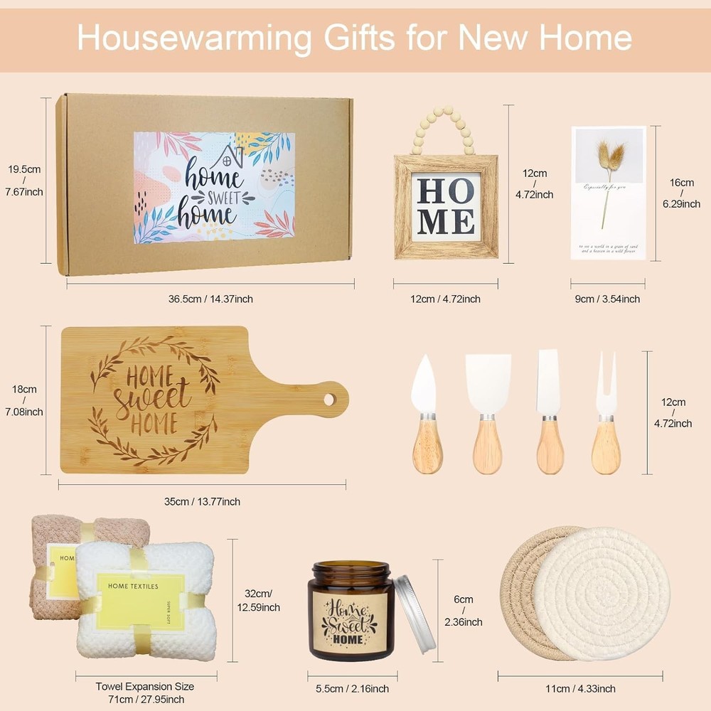 house warming gifts new home Unique Housewarming Gift Baskets: It will be a warm to someone who has moved into a new house by giving them this house warming gifts. Home is the place where everyone feels safest and warmest. Make every corner of new home cozy and stylish! A Heartwarming & Practical Set: With housewarming gift ideas, this house warming gifts basket is packed with 7 items, including 1 serving board, 4 cheese sets, 1 serving Board, 2 coaster, 1 home decoration, 2 soft towels and 1 greeting card which you can write down your sincere wishes and love. Ideal Personalized Kitchenware: this Wooden kitchenware to enjoy delicious food. The charcuterie board is engraved with "home sweet home", and it can hold fresh fruit, meat, cheeses, bread and nuts, enhancing the taste of your kitchen.The 4-piece cheese set with wooden handle and stainless steel sharp blades makes savoring food easier. The solid wood material is great for all types of cheese. Home Sweet Home Candle: Warm your new house with a scented candle, adding a lifestyle touch to the new home. Immerse in the house warming fragrance of this lavender and sage candles, relaxing body and light up every corner of the new home. Decorate house with this unique home sign hanging, which is made of high quality strong wood material, adding warm atmosphere to the new house. New Home Coasters: 2 colors woven coasters for drinks, boho and minimalist style with nature material, perfectly fits into any home décor style such as kitchen, bedroom, dining table or every corner of your home. The greeting card comes with dry flowers, wirte down your sincere wishes and love for someone you care about.