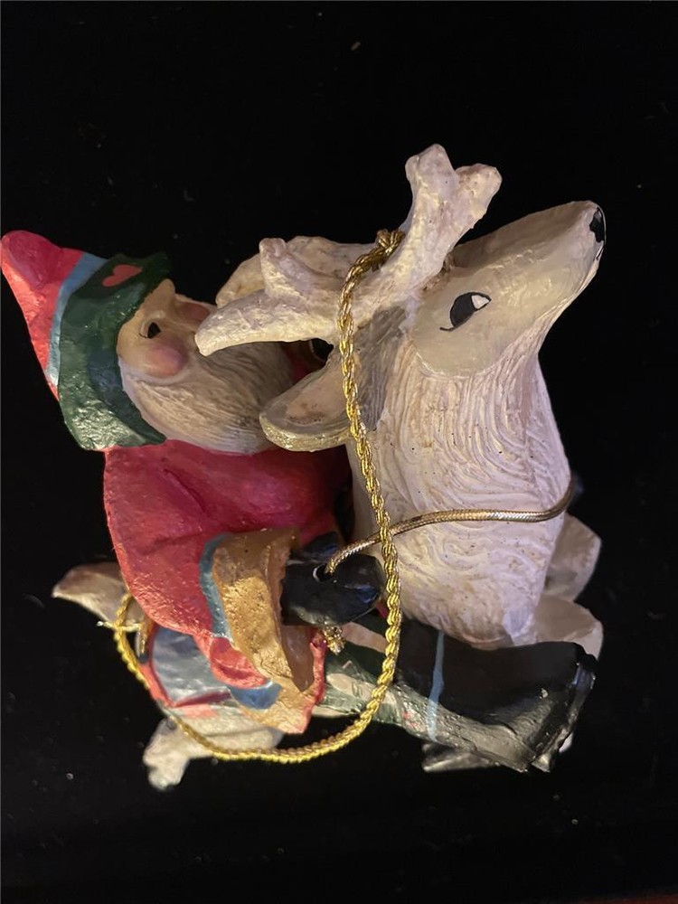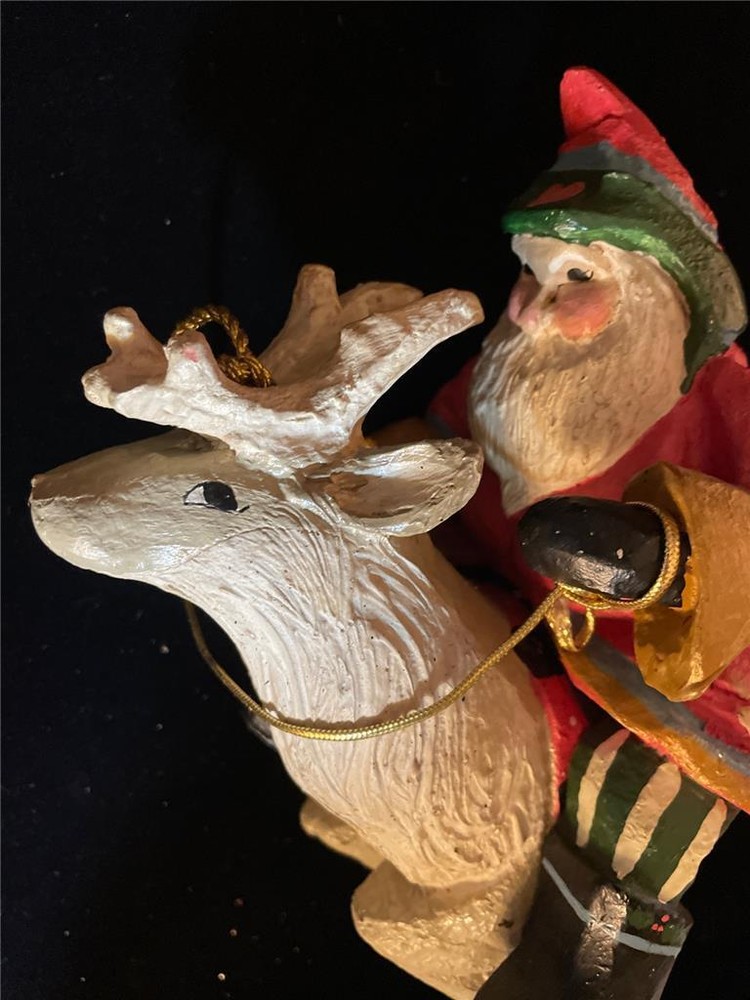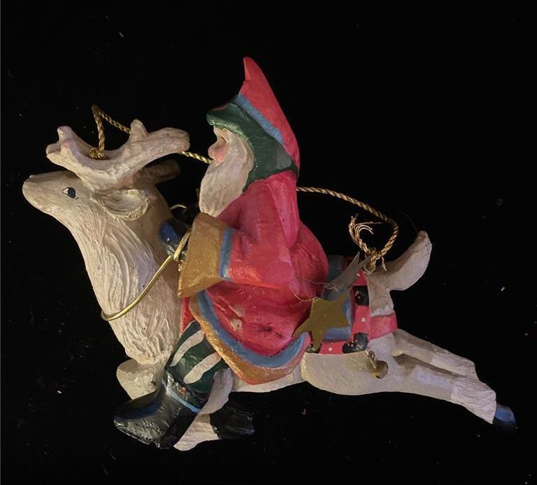 HOUSE OF HATTEN ENCHANTED FOREST LARGE HANGING SANTA ON REINDEER CHRISTMAS 1993 HOUSE OF HATTEN ENCHANTED FOREST LARGE HANGING SANTA ON REINDEER CHRISTMAS 1993 Click images to enlarge Description For sale is a large hanging House of Hatten Christmas ornament; it is 9" high and 12" wide; Santa is riding on a reindeer. I believe he's from the Enchanted Forest collection, and it is in very good condition. Please ask any questions before purchasing. If you buy multiple items from me and would like to combine shipping, please put all items in your cart and buy together; then you should receive combined shipping. I try to ship in one day, and I appreciate being contacted (or feedback left) to let me know my items have arrived safely. Thanks for looking! Get images that make Supersized seem small. Showcase your items with Auctiva's Listing Templates! THE simple solution for eBay sellers. Track Page Views With Auctiva's Counter