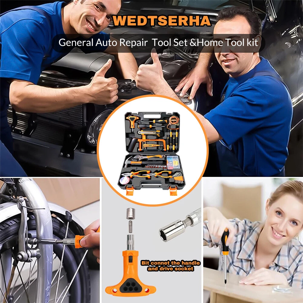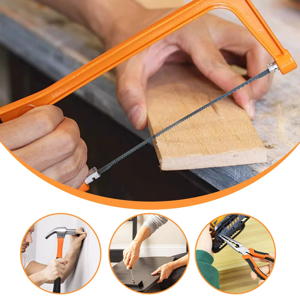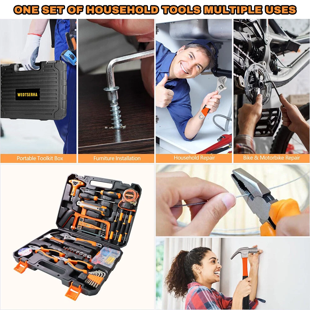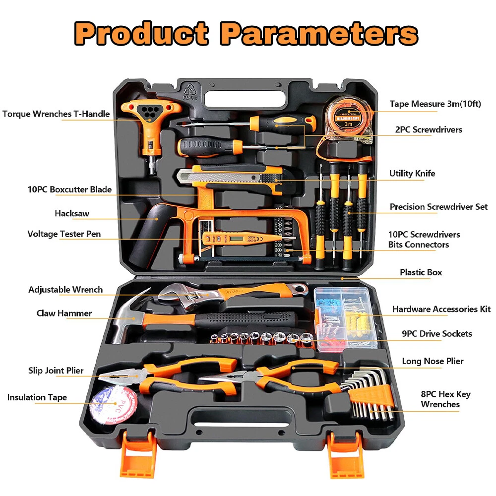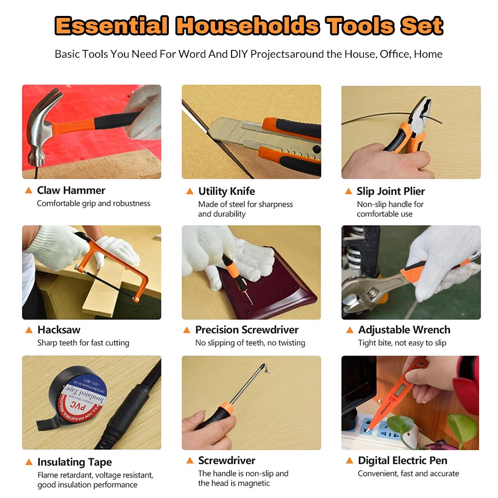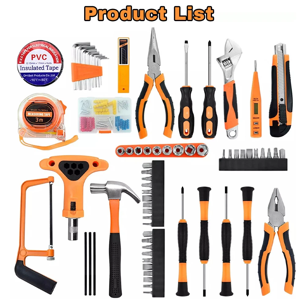 【HIGH QUALITY TOOL SET 】The home tool kit with case is forged from high-quality steel and finished in high-polish chrome for durable strength and anti-corrosion. 【COMPLETE H OUSEHOLD TOOL SET】 This basic tool kit for home contains most of household tools for doing DIY projects,home repair and daily use,includes hacksaw,adjustable wrench,claw hammer,pliers,ratchet wrench,drive sockets,screwdrivers,utility knife,tape measure,voltage tester pen,insulation tape,allen wrench,hardware kits and screwdrivers bits connectors. 【PORTABLE TOOL SET FOR HOME】 Starter tool kit for household is organized in a folding sturdy handy blow molded storage case,easy to carry and storage without taking up much space. 【HOME TOOL KIT FOR ALL PURPOSE】 You can use this tool box sets for men to do jobs such as putting up pictures,assembling furniture,hanging tv and do home repairs around the house.The diy tool kit is also a warming gift for men on Father's Day or women,college students,handyman,homeowner,construction workers or staters on Birthday and Anniversary. 【YOUR STARTER BASIC TOOLKIT】 One home maintenance tool kit helps you to resolve all repair jobs.All set of tools are made of soft grip handle,lightweight and comfortable to hold,all the household tools for home in the tool box set with tools meet or exceed the ANSI. 【 INCLUDED COMPONENTS 】 1 x Ratchet Wrench,2 x Screwdrivers,4 x Precision Screwdriver Set,1 x Utility Knife,1 x Tape Measure 3m (10ft),1 x Voltage Tester Pen,1 x Hack Saw,8 x Hex Key Wrenches,9 x Drive Sockets,1 x Adjustable Wrench,1 x Claw Hammer,1 x Long Nose Pliers,1 x Slip Joint Pliers,1 x Insulation Tape,1 x Hardware Accessories Kit,30 x Screwdrivers Bits Connectors,3 x Saw Blades,10 x Utility Knife Blades,1 x Carrying Case Why Choose OUR Home Tool Kit with Case? Handsaw 2-in-1 hacksaw with 3 replaced blades,suitable for cutting wood and plastic pipe. Ratchet Wrench Includes 1 ratchet handle and 30 piece screwdriver bits,meet most of your needs for DIY Projects and home maintenance. Claw Hammer Our claw hammer is forged from high-grade steel and finished in high-polish chrome,perfect for carpentry,household repair, construction work and general maintenance. Pliers Set Our pliers set includes needle nose pliers and slip joint pliers, made of high-grade steel,perfect for home improvements and DIY projects. Adjustable Wrench Our adjustable wrench is made of High quality forged carbon steel,heat-treated for durability. Screwdriver Set Includes magnetic screwdrivers to attract screws,helping reduce dropped and lost fasteners. Precision Screwdrivers Comes with 6pcs precision screwdrivers for computer, watches, glasses repairs. Hex Key Allen Wrench Includes 8 diffrent size hex key set,made of chrome-vanadium steel for rugged strength,perfect for quickly tightening or loosening fasteners.