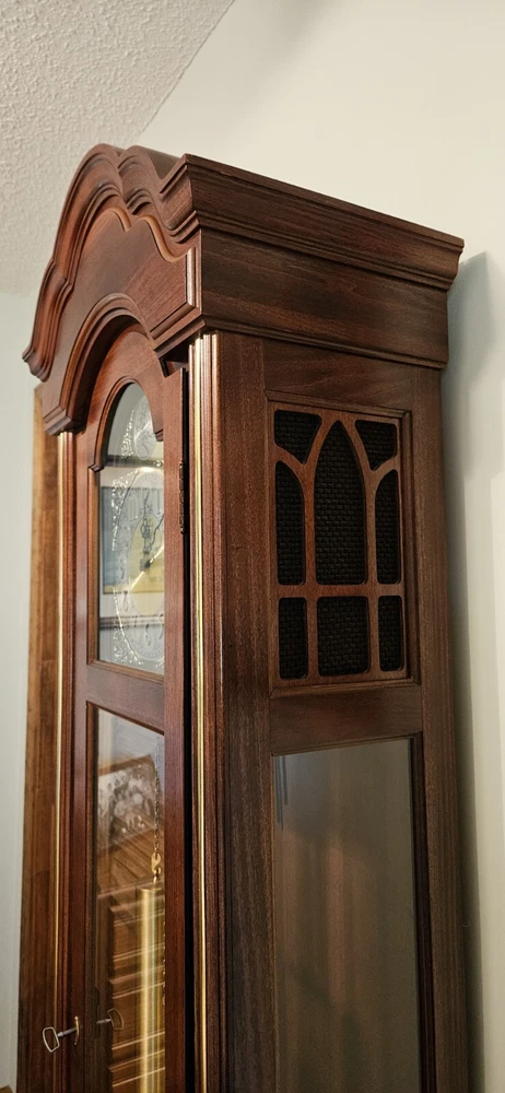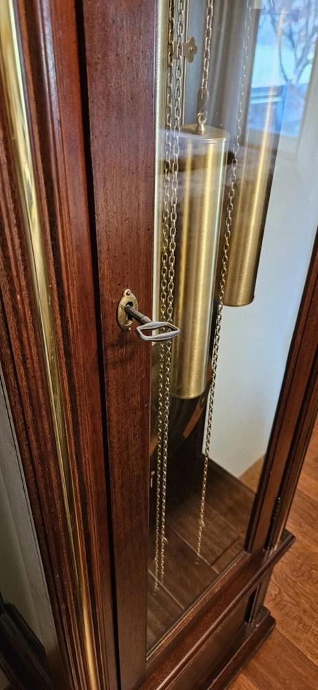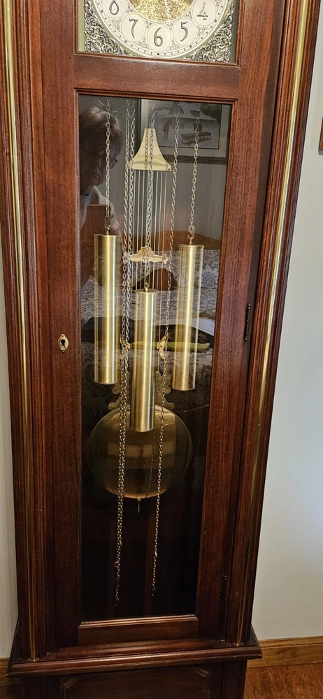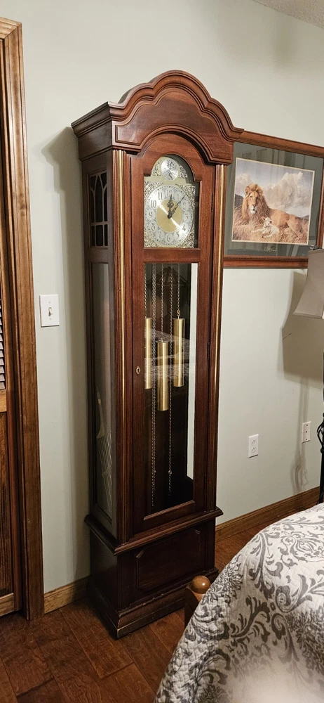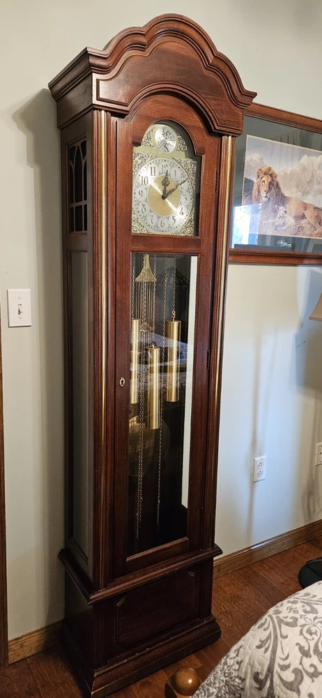 This beautiful Howard Miller Odette Grandfather Clock is a perfect addition to any antique collection. With a width of 20 inches, it features a mechanical movement and an analog display type. The clock is made of high-quality wood material with a cherry finish, and it comes from the late 20th century era (1970-1999). The clock is a vintage piece with a Westminster chime sequence and a longcase/grandfather clock type. It is an original piece from the Howard Miller brand, manufactured in the United States between 1980-1989. The clock is perfect for collectors who are looking for a unique and beautiful antique piece to add to their collection. To my knowledge, this particular clock is no longer manufactured.