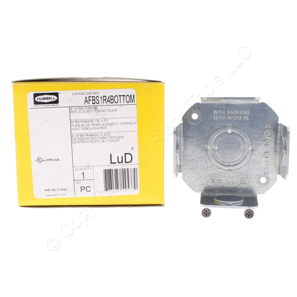 Fruit Ridge Tools, LLC Our eBay Store Contact Us Add to Favorite Sellers Hubbell Replacement 4" Base w/Knockouts for AFBS1R4BASE Floor Box AFBS1RBOTTOM Hubbell AFBS1RBOTTOM replacement base for a AFBS1R4BASE aluminum floor box. Features include: Replacement base with mounting screws for AFBS1R4BASE box Bottom knockouts: concentric 1/2", 3/4", 1" Side knockouts: (4) 1/2" This is New Old Stock and is returnable for any reason. (SKU # HUBAFBS1RBOTTOM-EA; Weight: 0.4500 lbs.)