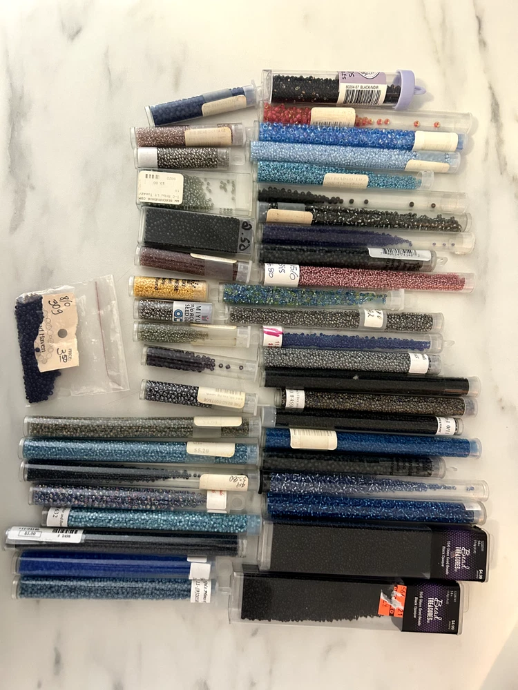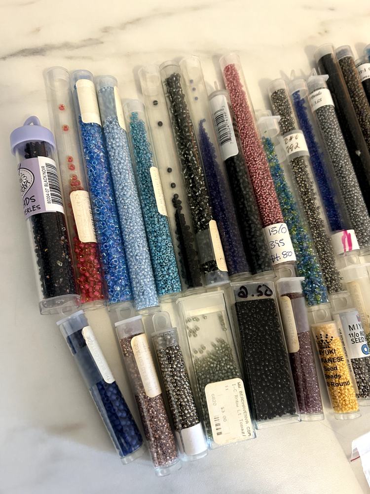43 total tubes/ bags of mixed seed beads of many colors, styles, and sizes. Czech/ Toho/ Miyuki. Each tube originally ranged in price from $1-$6 back in the 2000's, worth more today. Mix of unopened and partially used tubes.