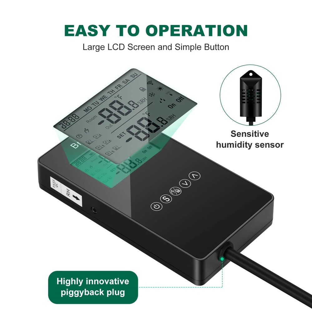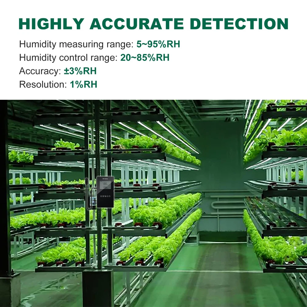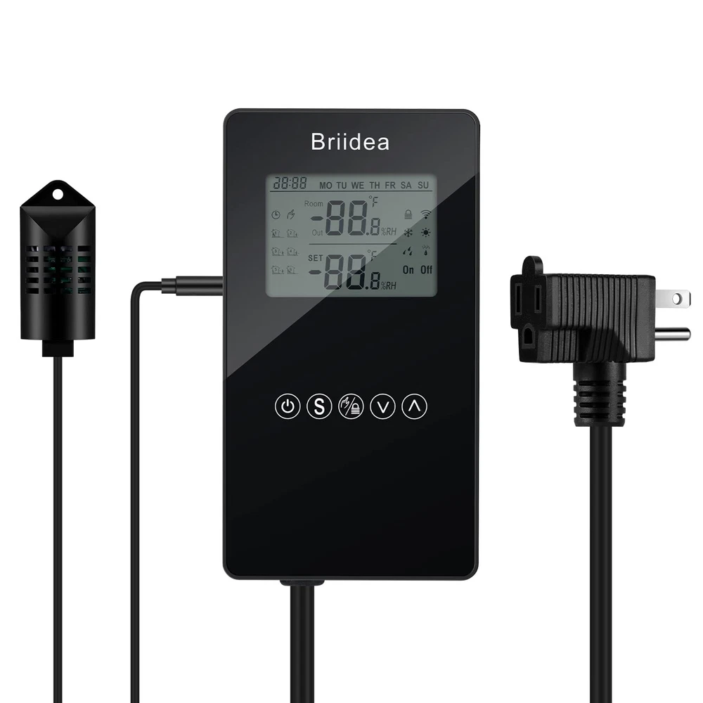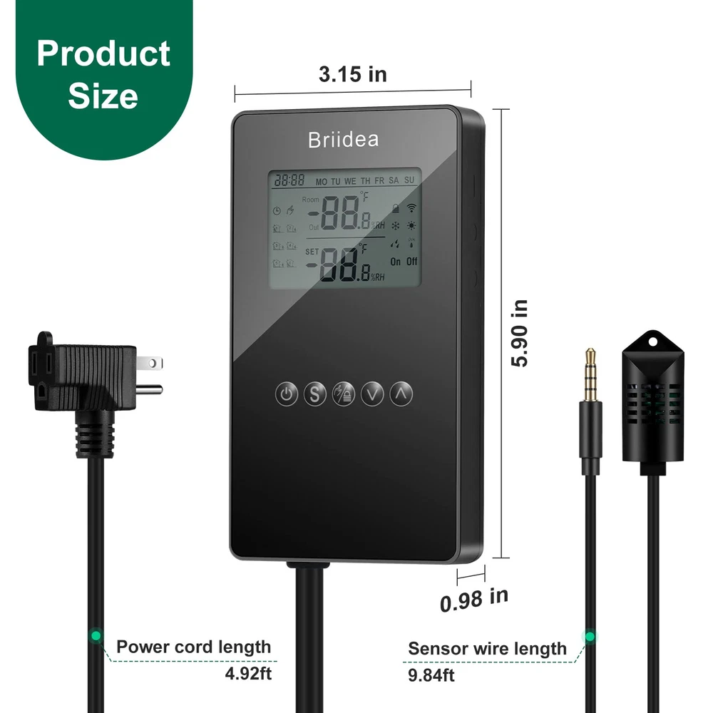 Humidity Controller, Briidea Pre-Wired Humidistat Humidifier Dehumidifier with LCD Display High Accuracy Humidity Sensor, Ideal for Greenhouse Mushroom Grow Tent Description Features: MULTIFUNCTION: The humidity controller has a series of practical functions, including dehumidification and humidification mode, manual and automatic mode, high or low humidity alarms etc. Turn on/off your equipment automatically to reach the ideal humidity level. Humanized intelligent operation design is realized HIGHLY ACCURATE DETECTION: The use of high-end and superior chip make sure the service life of the sensor is guaranteed. Accuracy can be 3%RH, to precisely provides a comfortable humidity environment you need. Support humidity calibration function EASY TO OPERATION: Large LCD screen with simple but grand appearance design looks very clean and bright, more intuitively displaying all necessary parameters. Simple 3-button for easy operation PROTECTION FEATURE: To prevent cycling and being overloaded in a short time which will damage or harm to the device and its components, it is standard configured with automatic minimum run-time setting, delay protection for control output. And also with data memory function when suddenly power off Product Details: Brand: briidea Material: Plastic Color: Black Product Dimensions: 1"L x 1"W x 1"H Manufacturer: briidea Item Weight: 1.1 pounds Product Dimensions: 1 x 1 x 1 inches Country of Origin: China Item model number: MK-041 Color: Black Material: Plastic Special Features: Humidistat Batteries Included?: No Batteries Required?: No Date First Available: May 15, 2023 Handling We will ship all orders within 3 business days of payment. Delivery We do not ship outside of the Continental US. Feedback We take our reputation seriously, we buy and sell online, so we understand the value of trust. If you are unsatisfied with your order, please contact us and we will work with you to resolve it to your satisfaction.