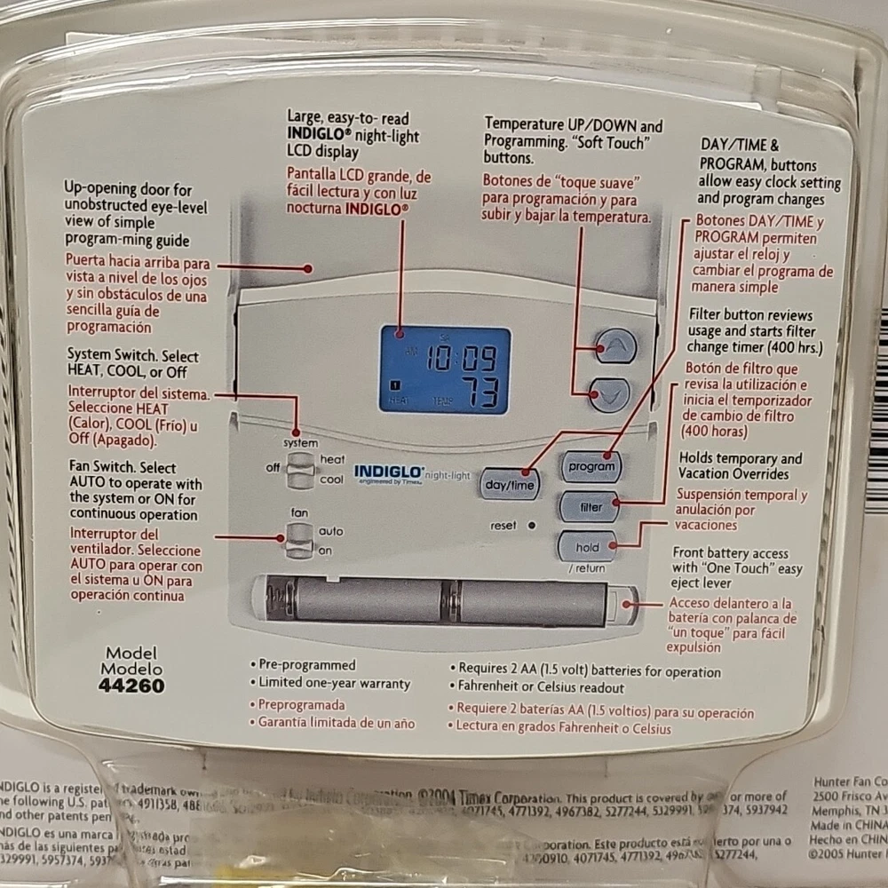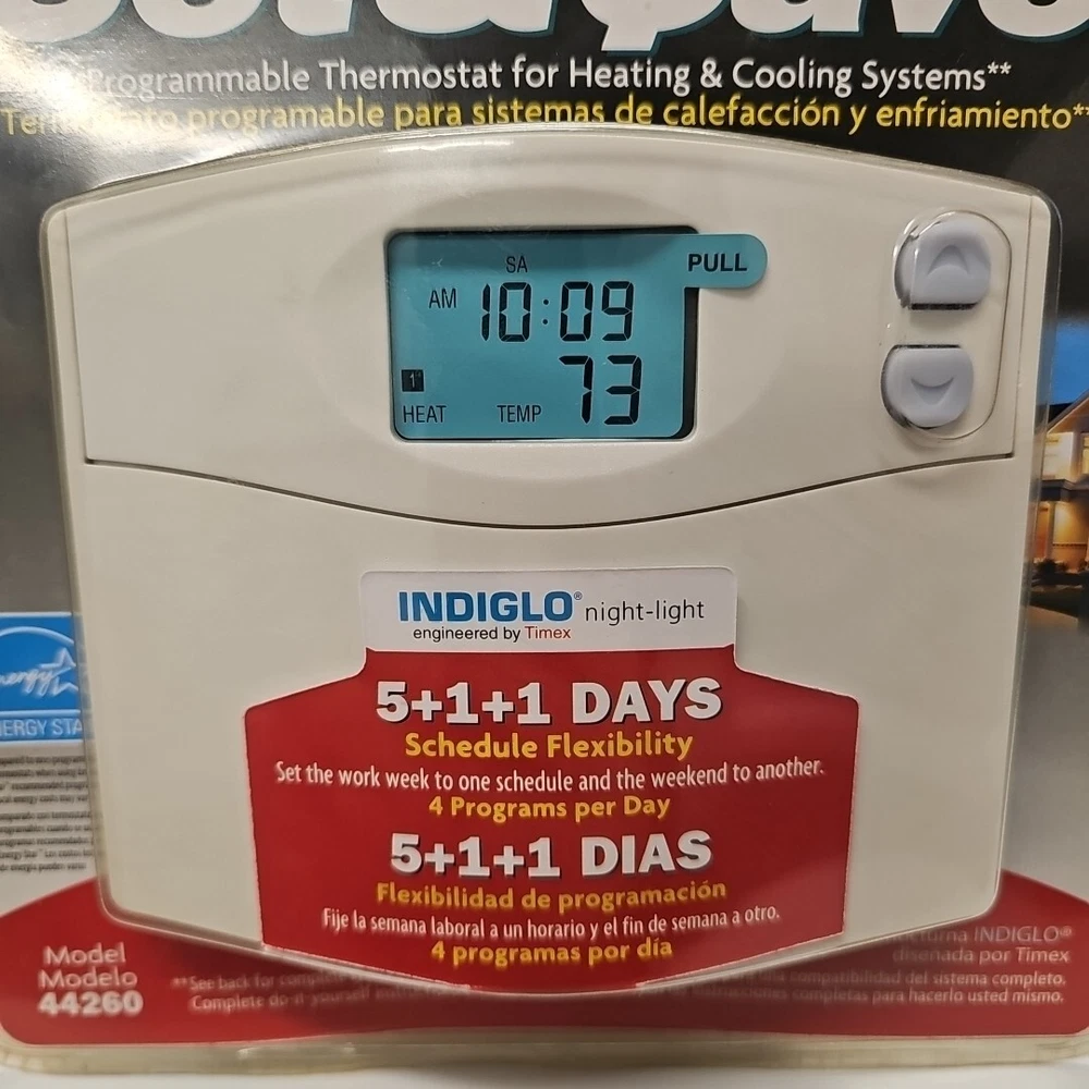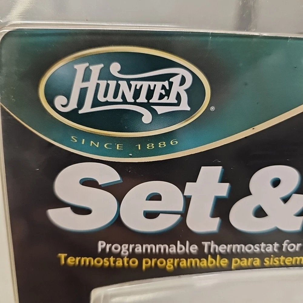 BRAND NEW FACTORY SEALED This Hunter Set & Save 44260 programmable heating and cooling wall thermostat is a must-have for any home. With its sleek white color and digital display, this thermostat is compatible with universal and certain Hunter Home Comfort models. It has a 2-wire configuration and requires AA batteries to operate. The thermostat features open circuit protection and overcharge protection, making it a reliable choice for any home. It has a curved shape and is wall-mounted for easy use. The thermostat is programmable with 5+1+1 days and has a voltage of 24V. Its sensor technology ensures accurate temperature control, while its resistance properties make it dust and abrasion resistant. The thermostat also supports auto system switching and has a smart home protocol of HomePlug.