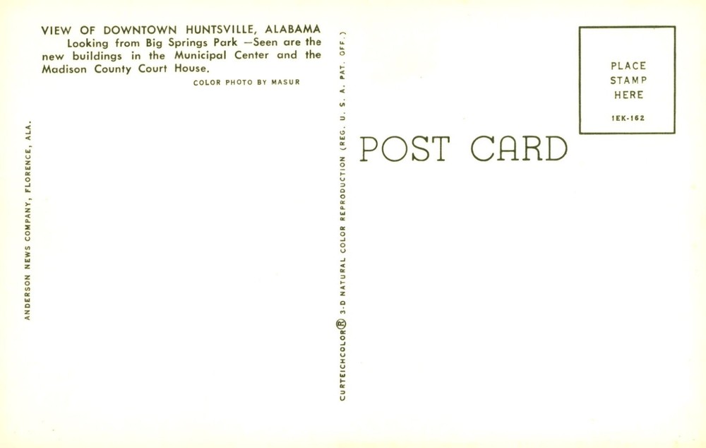 MAKE AN OFFER. THE MORE YOU BUY THE BETTER DEAL I WILL ACCEPT Enjoy a picturesque view of downtown Huntsville, Alabama from Big Springs Park, showcasing the new buildings in the Municipal Center and the Madison County Court House.