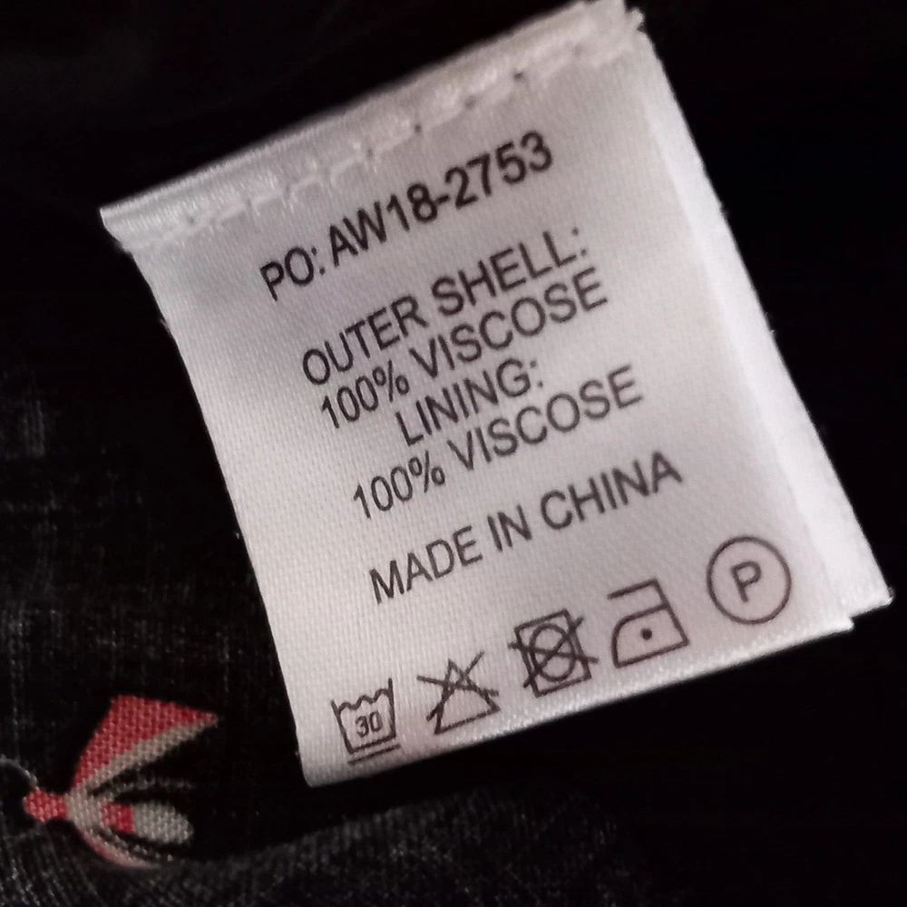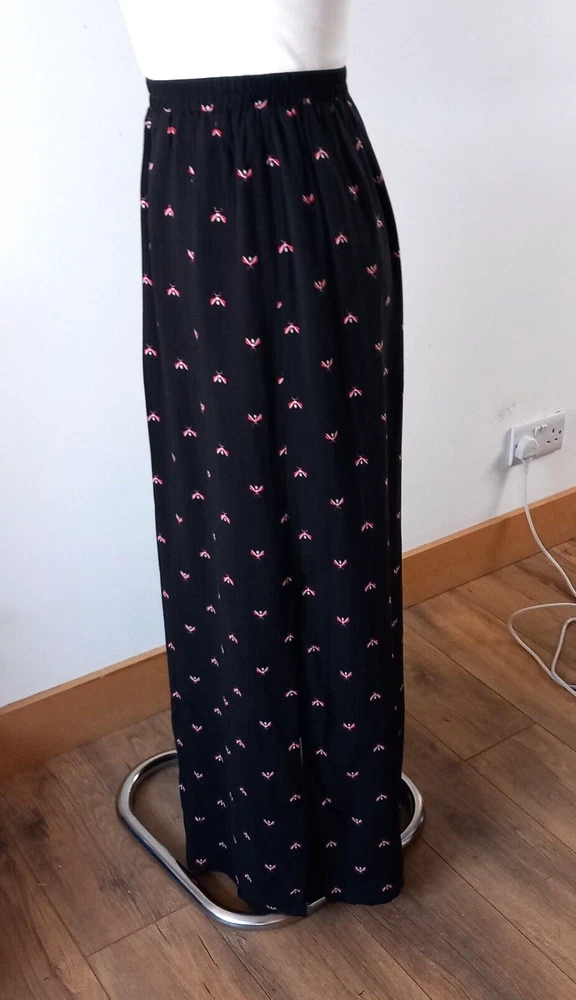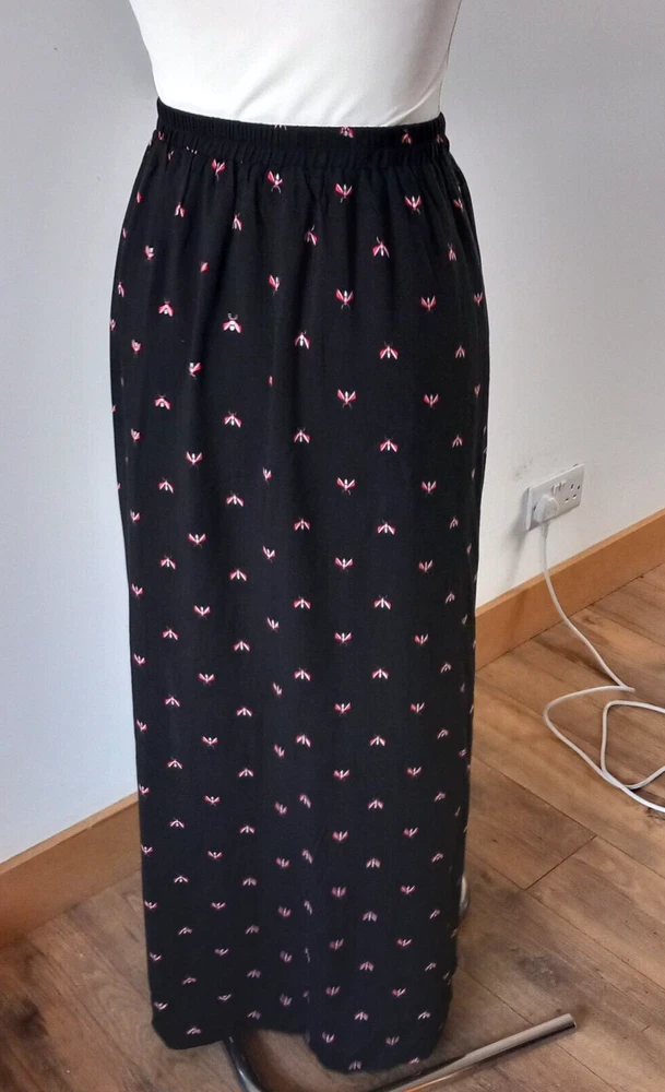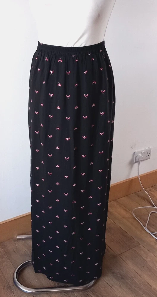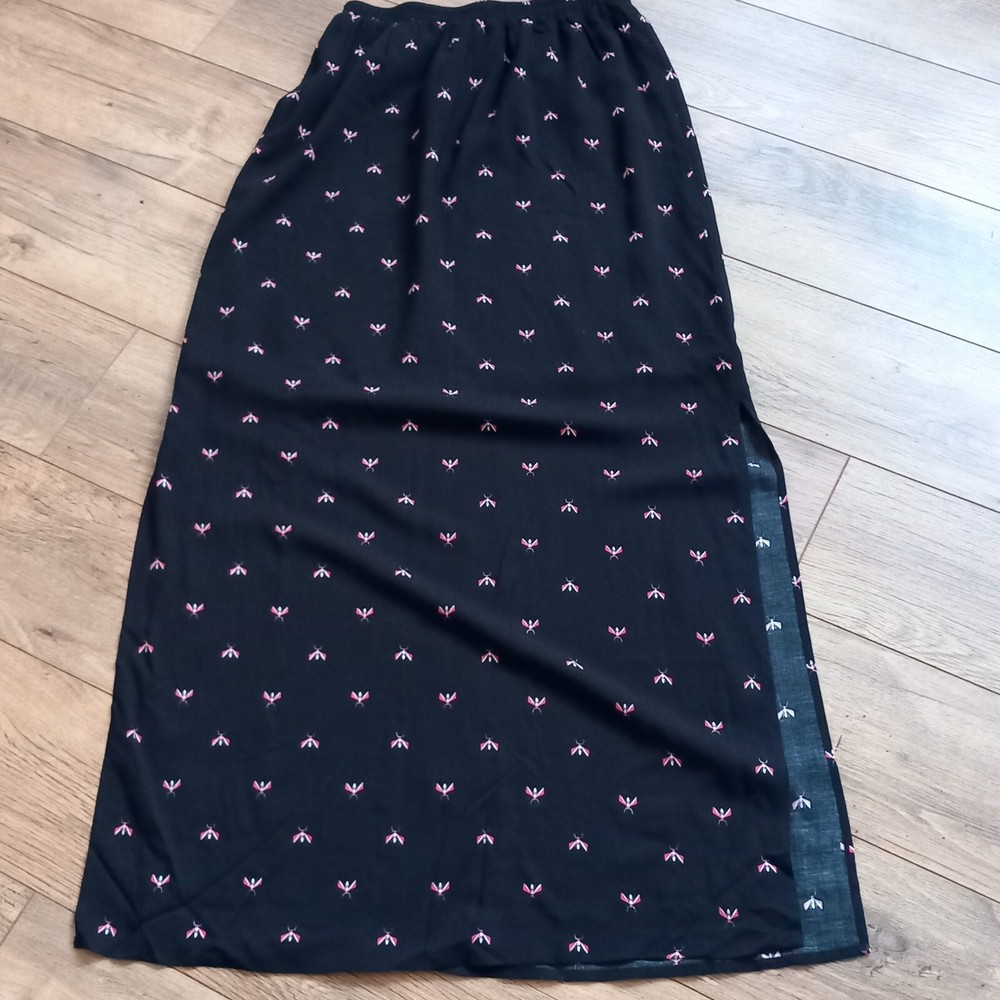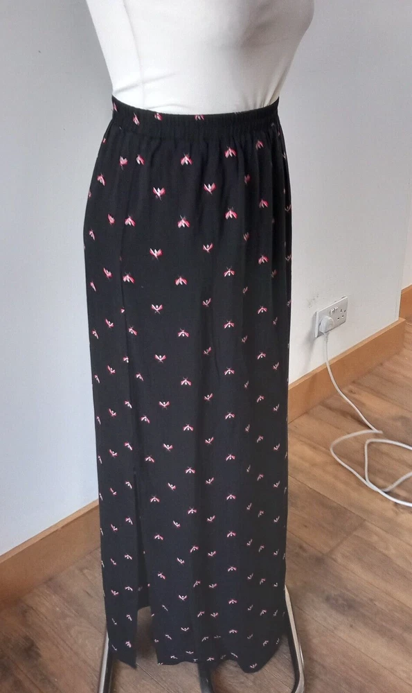 Gently used condition with no faults found. Fab flying insect pattern on black long side split skirt from HUSH. Measures 12" across elasticated waist area which goes up to 14" approx, 18" across hip area approx, 40" long. Part lined. Viscose.