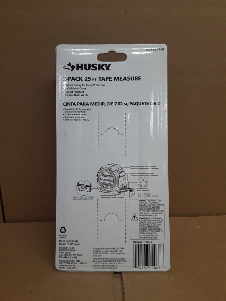 This Husky measuring tape is the perfect addition to your toolkit. With a length of 25 feet, it's ideal for measuring large distances accurately. The tape is made from durable plastic and features a retractable design for easy storage and transport. The tape comes in a sleek black color and has a width of 8 inches, making it easy to read and measure. It's made in China and comes with a lifetime manufacturer warranty. This tape is a must-have for any DIY or professional project.