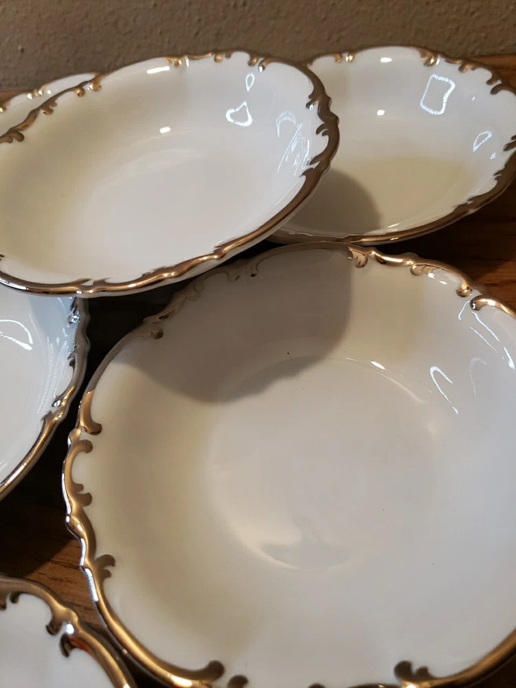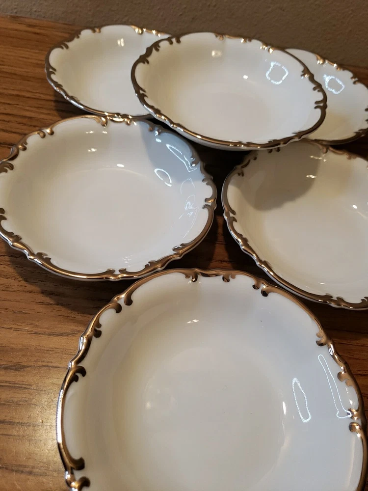 This Hutschenreuther Revere bowl is a beautiful addition to any collection. Made in Germany, it features a stunning white and platinum fruit/desert/sauce design. The bowl is 5¼ inches wide and made of high-quality porcelain material. Perfect for any occasion, this bowl is sure to impress guests and add a touch of elegance to your table setting. The brand is well-known for its exceptional quality and attention to detail, making this bowl a must-have for collectors and enthusiasts alike. Set of 6.