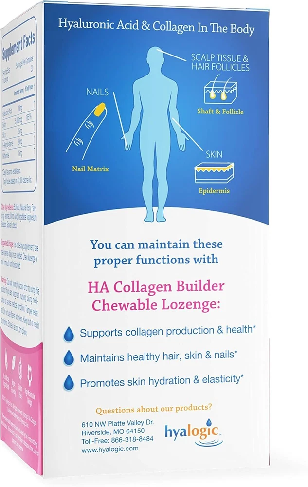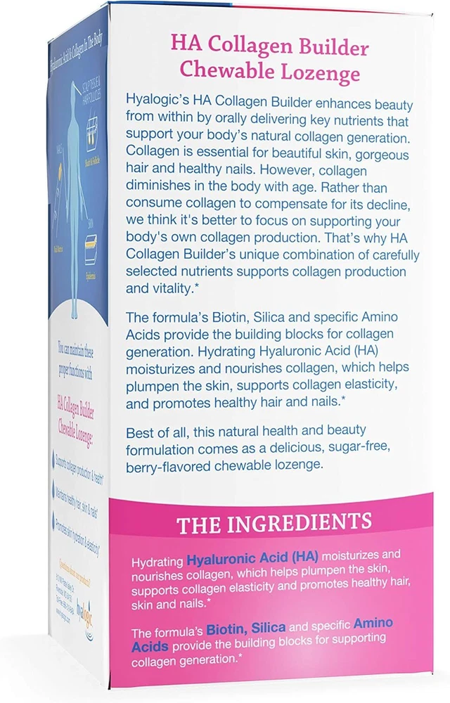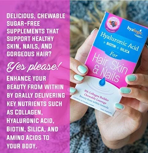 Hyalogic Hair Skin & Nails Hyaluronic Acid Collagen Builder – Delicious Berry Flavored Collagen Boost Chewable Lozenges – Sugar Free Vegan Collagen Ideal to Enhance Your Natural Beauty – 30 Count