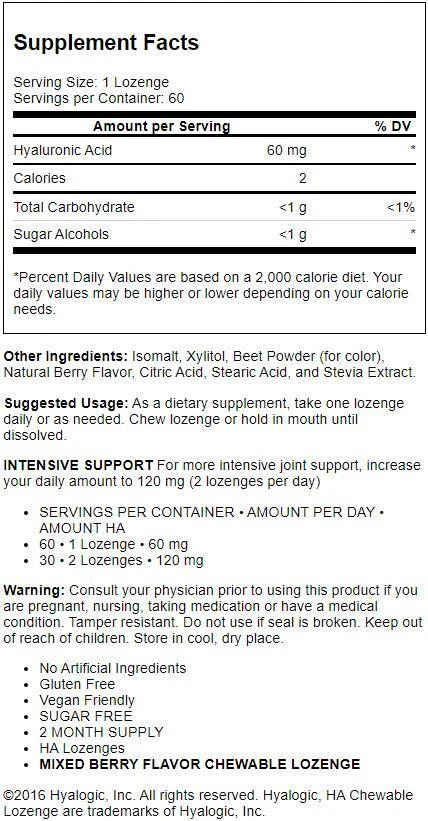 Joint health is so easy--and tasty--with Hyaluronic Acid for Joints, Skin & Eyes from Hyalogic. This formula delivers 60 mg of hyaluronic acid (HA) in great-tasting mixed berry flavored lozenges. They dissolve quickly, so you get the benefit quickly and easily. HA helps lubricate joints and cartilage, hydrates skin and facilitates eye health. Promotes joint health and comfort Supports eye health Mixed berry flavored lozenges Gluten Free, Vegan, Vegetarian