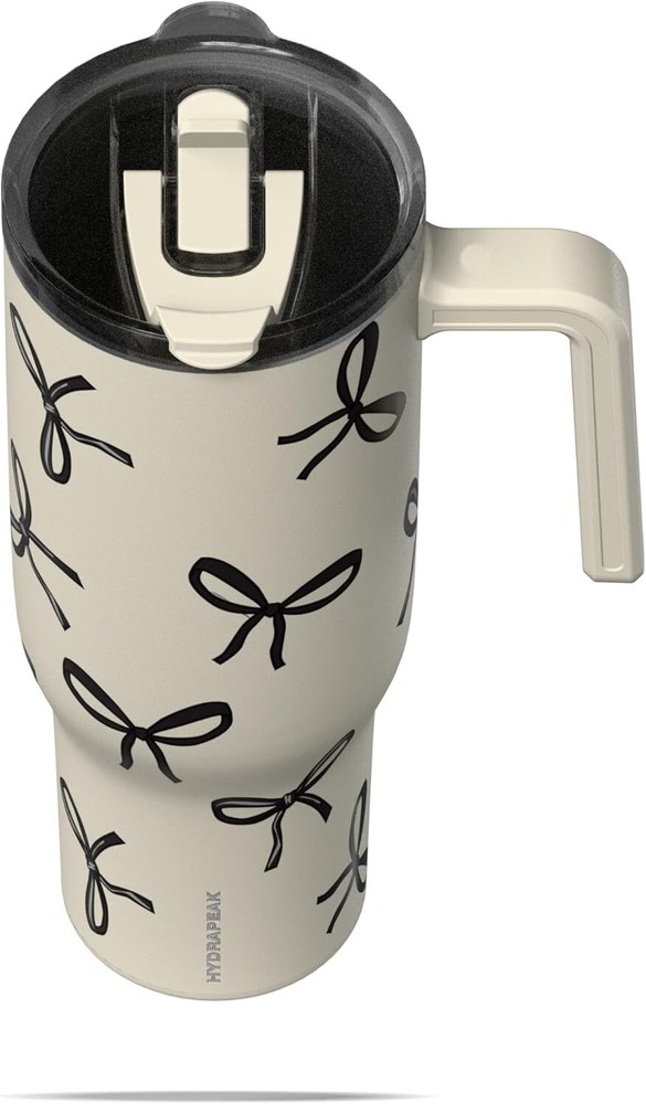 Hydrapeak Voyager 40 oz Tumbler with Handle and Straw, 100% Leakproof Insulated Tumbler with Sip and Straw Lid, Made of Stainless Steel, Cup Holder Friendly Base (Black Bows) PREMIUM: This Hydrapeak Insulated Tumbler with Straw and handle is made of high quality 18/8 food grade stainless steel that makes it sturdier, more durable, and ensures the cup remains odor-free. This travel cup was made to take everywhere. INSULATED/30 HOURS: This stainless steel cup will keep your drinks COLD for up to 30 hours, and HOT for up to 12 hours using Hydrapeaks double wall insulation technology. This technology also makes the insulated tumblers sweat free! This makes it the perfect tumbler with lid and straw. SPILL PROOF LID STRAW: Our Hydrapeak stainless steel tumbler with handle features a spill proof lid making the 40 oz tumbler ultra-portable. Let spills and leaks be a thing of the past. Additionally, the non-slip rubber base prevents sliding and scratching along with a sleek modern tumbler look. FITS CUP HOLDERS: This insulated cup with straw can be used as a travel coffee cup or water tumbler and it fits in most cup holders! This thermal cup is designed for everyday use, perfect for at home, the office, the gym and great for on the go. Also, a great to use as a water bottle with straw. Size: 40 Ounces Brand Hydrapeak Color Black Bows Special Feature Spill Proof, Non-Slip, Condensation Resistant, Vacuum Insulated, Double Wall Style Art Deco