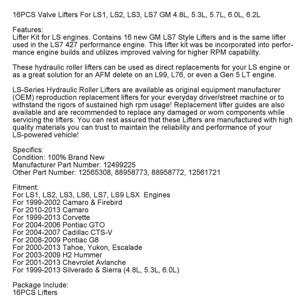 Auto Transmission Valve Body 01M325283A For VW Jetta Golf Beetle 1999-2005 170.78 USD Free shipping For Peterbilt Door Latch Striker R56-6017 15.78 USD Free shipping FUEL PUMP FUSE RELAY fit for Yamaha YZF R1 R6 FZ1 Fazer FZ8-N Naked 5VK-81950-40 28.87 USD Free shipping Sun Visor Holder Retainer Clip AL8Z-7804132-AA For Ford Escape 2010-2012 12.59 USD Free shipping Oil Cooler Filter Housing Seal Gasket O-ring 21304-JA11A For Nissan Armada Titan 10.15 USD 10.68 USD Free shipping 5% off M18X1.5 Female Aluminum Weld On Fitting Bung US 11.2 USD 11.79 USD Free shipping 5% off Regulator Rectifier for Johnson Evinrude 9.9-60Hp 82-03 173692 581778 582304 17.85 USD 18.79 USD Free shipping 5% off Clutch Booster Fit for Nissan Patrol GQ Y60 TB42 & TD42 Diesel # 30630-VB000 67.87 USD Free shipping H8 For`Philips CoreDrive Halogen Fog 12360CDC1 12V 35W PGJ91-1 M2 13.79 USD Free shipping Ignition Cover Gasket For 250 EXC-F XCF-W Six Days XC-F 2006-2011 77030140000 T9 12.15 USD 12.79 USD Free shipping 5% off Black mirror delete blanking block off plates fits BMW S 1000 RR 2020-2023 19.72 USD Free shipping Fuel Injector 16600-88G10 Fit Nissan D21 Pathfinder Quest Mercury 3.0L V6 YU 19.83 USD 20.87 USD Free shipping 5% off STATOR + VOLTAGE REGULATOR + GASKET FOR SPRINT ST RS 955 TIGER 955I 2001-2006 139.87 USD Free shipping Pulsing Electrical Coil AM105573 AUC15118 For John Deere 325 335 345 425 445 455 20.49 USD 21.57 USD Free shipping 5% off Thermostat Cover Outlet Pipe w/Sensor For Jaguar Vanden Plas XJ8 & XK8 52.87 USD 63.79 USD Free shipping 17% off Trunk Lid Tailgate Back Door Control Module Unit For BMW X5 E70 X6 61357335274 59.78 USD Free shipping A Fantastic Shop Send us a message Our Store Seller Profile Feedbacks Save this seller Contact Hydraulic Roller Lifters Set 16 for Chevy 5.3 5.7 6.0 LS1 LS2 LS3 SBC LS7 UE Hydraulic Roller Lifters Set 16 for Chevy 5.3 5.7 6.0 LS1 LS2 LS3 SBC LS7 Features: Lifter Kit for LS engines. Contains 16 new GM LS7 Style Lifters and is the same lifter used in the LS7 427 performance engine. This lifter kit was be incorporated into performance engine builds and utilizes improved valving for higher RPM capability. This is not for Active Fuel Management Applications Specifics: Condition: 100% Brand New Manufacturer Part Number: 12499225 , HL-2148S, HL2148S Other Part Number: 12565308, 88958773, 88958772, 12561721 Fitment: For GM Passenger Cars 250 CID (4.1L) 1987-1988 265 CID (4.3L) 1994-1996 273 CID (4.5L) 1988-1992 300 CID (4.9L) 1991-1995 305 CID (5.0L) 1987-1993 350 CID (5.7L) 1987-1993 350 CID (5.7L) 1996-1996 350 CID (5.7L) 1992-1997 350 CID (5.7L) 1997-2005 364 CID (6.0L) 2005-2006 For GM Trucks 294 CID (4.8L) 1999-2005 305 CID (5.0L) 1996-2002 325 CID (5.3L) 1999-2005 350 CID (5.7L) 1996-2002 364 CID (6.0L) 1999-2006 378 CID (6.2L) 2007-2008 For Hummer 364 CID (6.0L) 2003-2006 378 CID (6.2L) 2008 Package Include: 16PCS Lifters About US About Our Items We strive to describe all items accurately and thoroughly, with the utmost care and attention to detail. However, to ensure a mutually satisfactory transaction, we kindly ask for your assistance in thoroughly reviewing the item description and photos, and addressing any questions before placing a bid. Customer Satisfaction We stand behind our commitment with exceptional service, a 100% money-back guarantee, and a dedication to customer satisfaction. I am readily available to address any inquiries or concerns you may have, both before and after your purchase. Our aim is to ensure your shopping experience is enjoyable and that you're delighted with your purchase. Feedback Your feedback is crucial to our business's success. If you're satisfied with your purchase and the service you received, we would greatly appreciate your positive feedback, along with an overall Detailed Selling Rating (DSR) of 5. Please take a moment to leave us positive feedback. Our eBay account is set up to automatically reciprocate positive feedback once yours is received. If you're considering leaving neutral/negative feedback or opening an eBay/PayPal case, we encourage you to reach out to us immediately. We're committed to resolving any issues to the best of our ability. Shipping Parcel will be shipped using Standard shipping method. For security purposes, items will be shipped exclusively to the confirmed address on Paypal. Please ensure your Shipping address is up to date before proceeding with payment. Estimated delivery time within the United States ranges from 3 to 10 business days, depending on your location. Returns We accept returns within 60 days from the date the buyer receives the item. If the item is found to be defective upon receipt, the customer has up to 30 days from the date of receipt to request an exchange for a new item or a refund. For returns due to a change of mind, we accept items in their original selling condition. However, if the package has been opened due to a mistaken order, it does not qualify for our return policy. Please note that the buyer is responsible for covering the cost of return postage. If you encounter any issues, please reach out to us via eBay message, and we'll respond within 24 hours. Hydraulic Roller Lifters +Link Bar Small Block for Chevy SBC 350 265-400 V8 183.87 USD Free shipping Engine Variable Valve Timing VVT Oil Control Valve For BMW 11368617694 29.79 USD Free shipping Camshaft Adjuster Magnet 06J109259A For Audi TT Q5 A4 VW Passat GTi Jetta 2.0T 28.3 USD 29.79 USD Free shipping 5% off Intake Camshaft 1M for VW Seat for Audi A4 1.8T USA 99.78 USD Free shipping 1 Pair Inlet Outlet Camshaft 058109021M 058109022B for VW Seat for Audi A4 1.8T 185.78 USD Free shipping 2x Camshaft Position Sensor ENTRY+EXIT For BMW E46 E39 E60 E38 E65 M52 M54 UE 24.24 USD 25.79 USD Free shipping 6% off Engine Camshaft Adjuster Magnet for Audi A3 A4 Q3 Quattro Q5 06L109259A UE 29.13 USD 30.99 USD Free shipping 6% off Intake + Exhaust Camshaft VVT Adjuster Pulley for BMW E46 E81 E82 E87 E90 E91 199.99 USD Fre