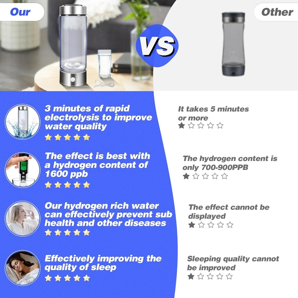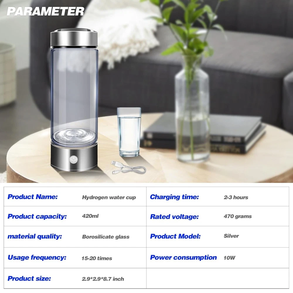 About this item Improve Water Quality in 3 Minutes : Using advanced SPE and PEM technology, 3 minutes of rapid electrolysis improves water quality. A single use can produce a high concentration of 1600 ppb hydrogen, turning ordinary drinking water into alkaline water rich in hydrogen ions. Suitable for all drinking water quality. Provide you with high quality water source. Food Grade Material : Made of food-grade borosilicate glass, it is sturdy and durable and does not contain any harmful substances. The lid of portable hydrogen water generator has a closed design and a thick sealing ring, which provides strong sealing and maintains the concentration of hydrogen. Don't let leaks become your worry. (❗❗ Please note that the hydrogen water cup should be placed upright when using it. If it is placed sideways or upside down, the water cup will leak due to pressure.) Easy to Use and Clean : After pouring 80% of the water into the hydrogen water cup. Just press lightly, the blue light on the bottom lights up and the hydrogen gas decomposes from the water. Equipped with a unique design, both the bottom and top can be easily unscrewed for easy cleaning, hydrogen water maker provide you with the best hydrogen-rich water experience. Simple Stylish Design : The bottom of hydrogen water maker bottle is equipped with a soft EVE pad, which is stable and non-slip. USB design allows you to make hydrogen-rich water anytime and anywhere, suitable for office, exercise, travel and other occasions. Large capacity of 420ml meets your health needs. Healthy Gift Options : Long-term drinking of hydrogen-rich water can promote metabolism, relieve muscle soreness, improve sleep, and provide health protection for your relatives and friends. We provide exquisite gift box packaging and high-quality after-sales service.This hydrogen water machine is a perfect gift choice! Product Description Hydrogen Water Bottle Wide Range of Usage Scenarios Food Grade Material