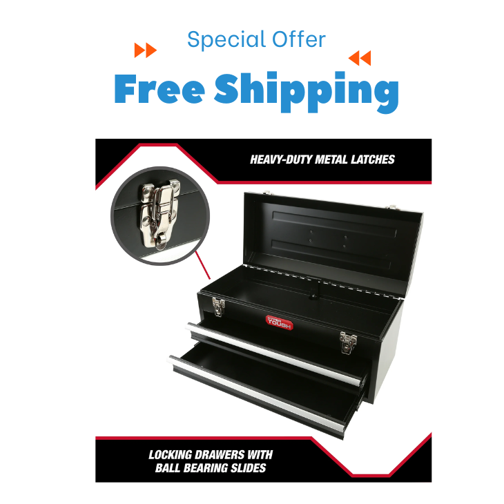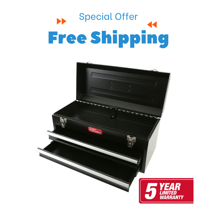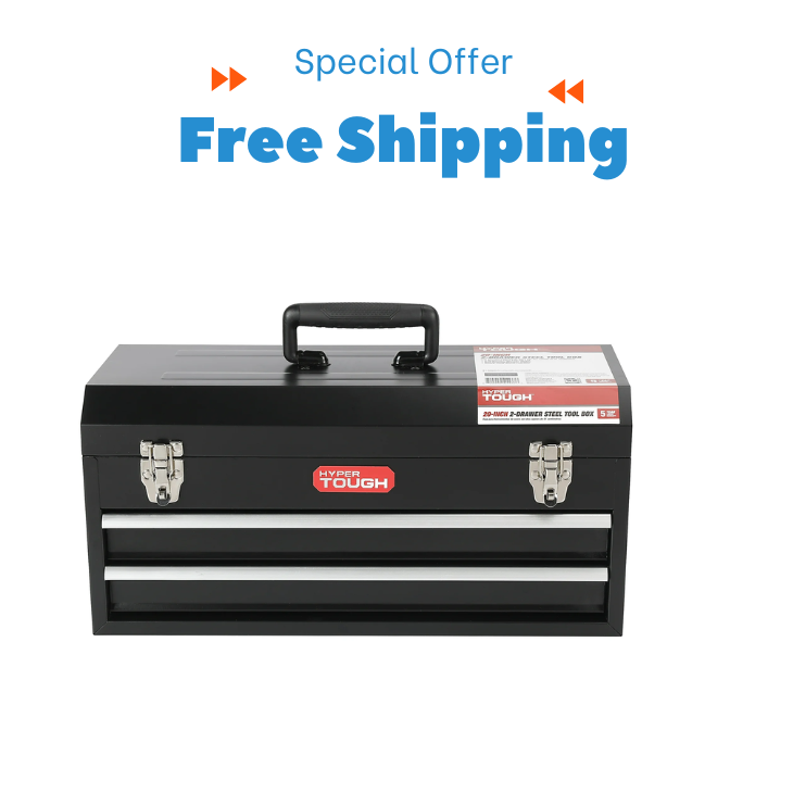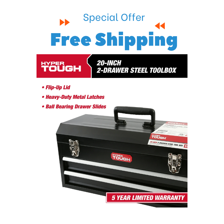 Hyper Tough 20-Inch 2-Drawer Tool Box with Flip-Up Lid is a reliable storage solution to keep your tools organized in one place. Featuring a sleek black steel design, this tool chest is built for durability and strength. Its ergonomic soft-grip handle ensures comfortable and secure transportation, making it easy to carry from one job site to another. The tool box includes a flip-up lid for additional storage and is secured with two heavy-duty latches that can accommodate a lock for extra security. The two spacious drawers glide smoothly on ball-bearing slides, providing easy access to your tools. Whether in your garage, workshop, or vehicle, this sturdy tool box is a perfect addition to keep your equipment neatly stored. Features: 20-inch steel tool chest with a black finish Soft-grip ergonomic handle for easy portability Flip-up top lid for extra storage space Heavy-duty latches that support a lock for added security Two ball-bearing slide drawers for smooth operation Suitable for home, garage, workshop, or vehicle storage Dimensions: 20" W x 8.75" D x 9.5" H Backed by a 5-year limited warranty Upgrade your storage with the Hyper Tough Tool Box today!